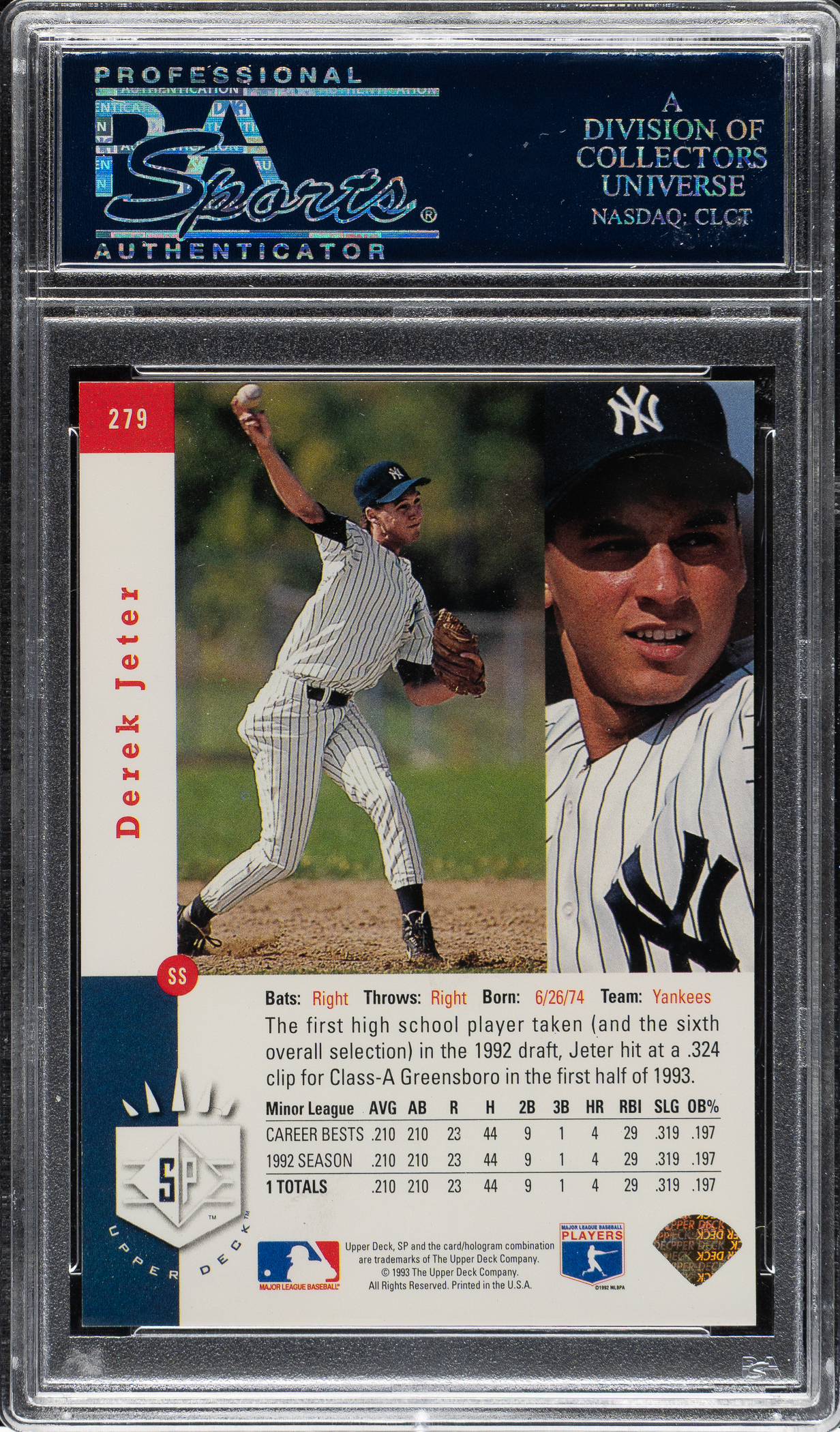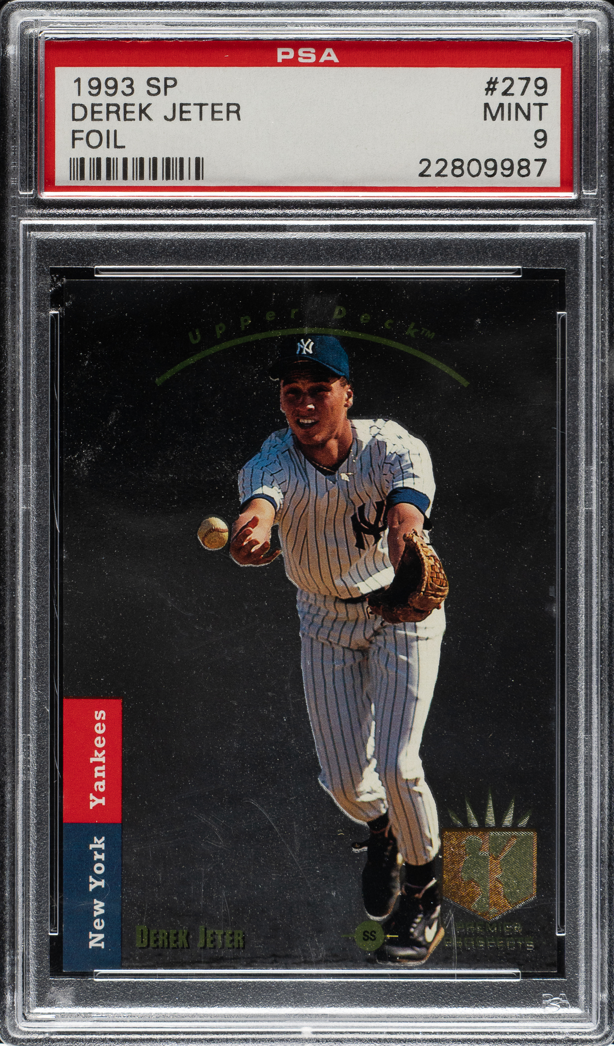 Graded MINT 9 by PSA. Exceptional example of Derek Jeter's rookie card from the 1993 Upper Deck SP Foil series. Jeter is featured as a key rookie card in a number of different issues from 1993, but the offered example is one of his most popular. One of the toughest modern classics to obtain in high grade, the delicate foil surface is almost entirely free of any scratches or wear. The corners are perfectly square. The reverse is clean. This is a truly MINT example of this important card.
