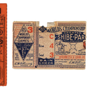 Pair of ticket stubs issued to the 1931 World Series between the Philadelphia Athletics and St. Louis Cardinals. 1) Game 2 played at Sportsman's Park (St. Louis). Won by the Cardinals 2-0. Vg-Ex. 2) Game 3 played at Shibe Park (Philadelphia). Won by the Cardinals 5-2. Pr. Total: 2 ticket stubs.