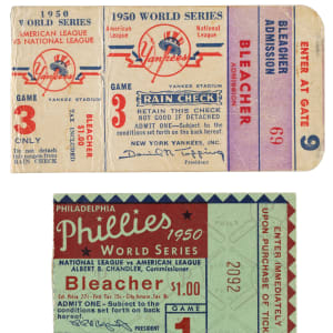Pair of ticket stubs issued to the 1950 World Series between the New York Yankees and Philadelphia Phillies. 1) Game 1 played at Shibe Park (Philadelphia). Won by the Phillies 1-0. Gd-Vg. 2) Game 3 played at Yankee Stadium (New York). Won by the Yankees 3-2. Fr. Total: 2 ticket stubs.