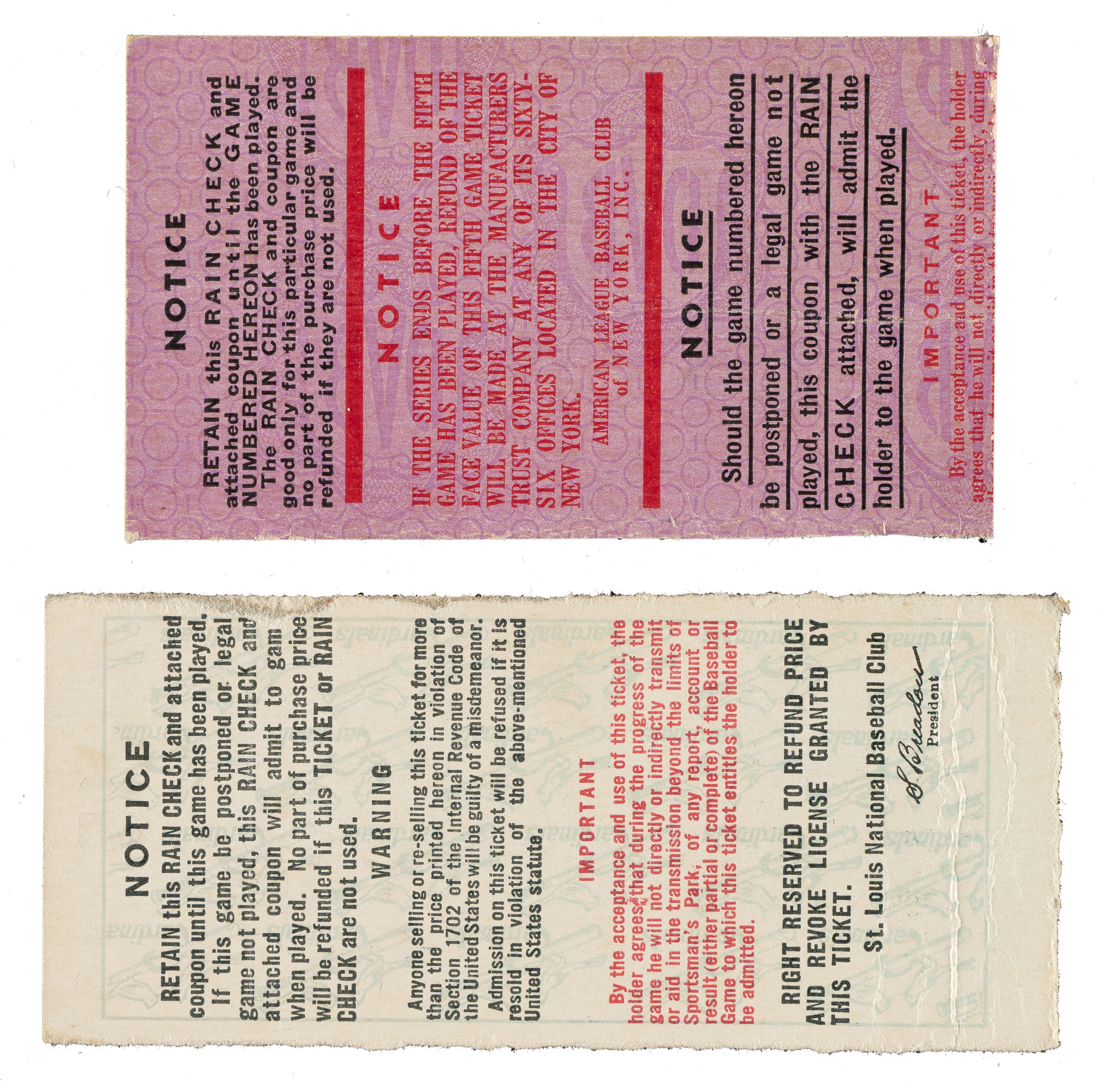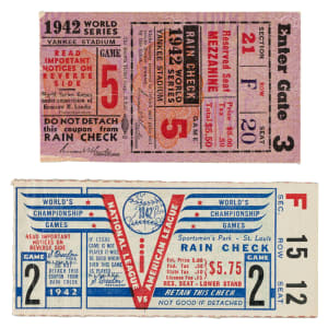 Pair of ticket stubs issued to the 1942 World Series between the New York Yankees and St. Louis Cardinals. 1) Game 2 played at Sportsman's Park (St. Louis). Won by the Cardinals 4-3. Gd. 2) Game 5 played at Yankee Stadium (New York). Won by the Cardinals 4-2. Fr. Total: 2 ticket stubs.