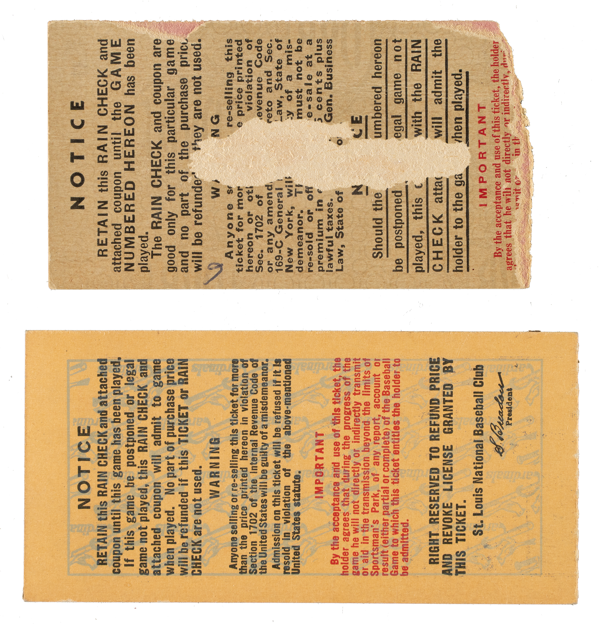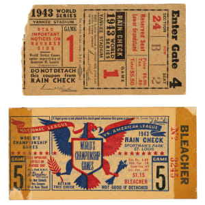 Pair of ticket stubs issued to the 1943 World Series between the New York Yankees and St. Louis Cardinals. 1) Game 1 played at Yankee Stadium (New York). Won by the Yankees 4-2. Pr. 2) Game 5 played at Sportman's Park (St. Louis). Won by the Cardinals 2-0. Pr. Total: 2 ticket stubs.
