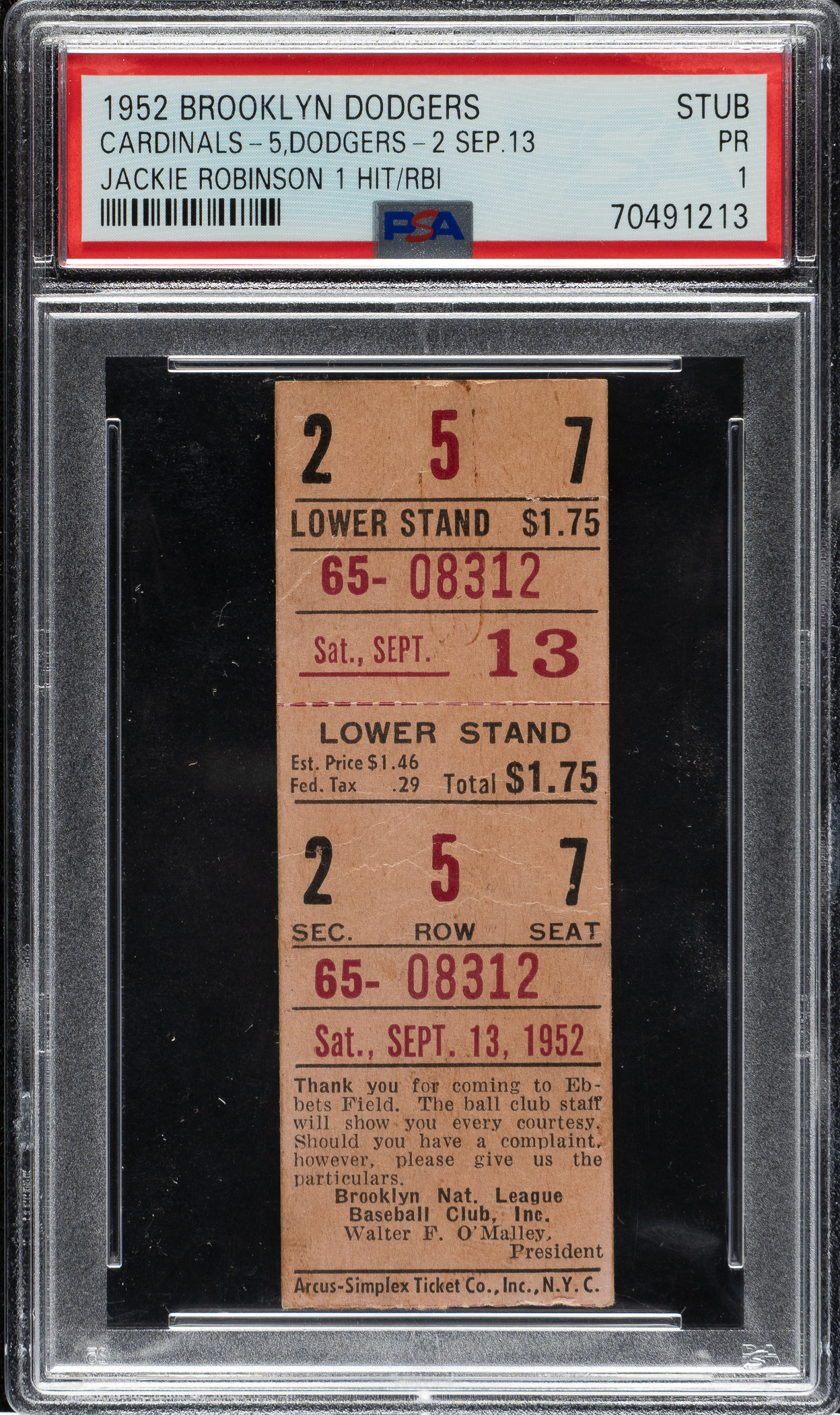 Graded POOR 1 by PSA. Ticket stub (1.25 x 3.5 inches) issued to a game between the Brooklyn Dodgers and St. Louis Cardinals on September 13, 1952, at Ebbets Field. The Cardinals defeated the Dodgers 5-2 despite an RBI single from Jackie Robinson.