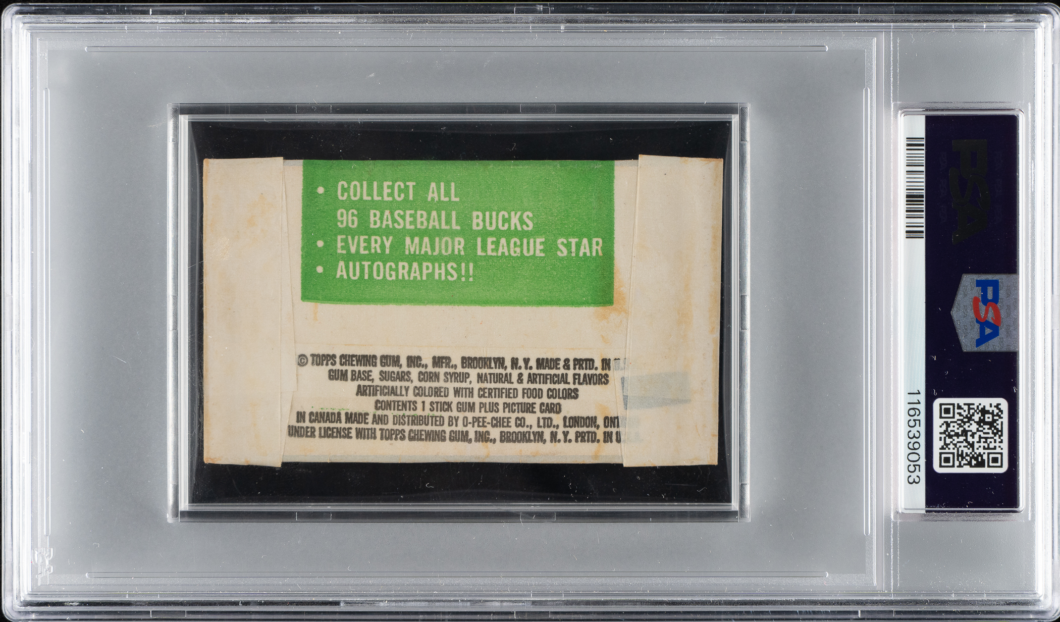 Graded NM-MT 8 by PSA. Highest-graded example! Original unopened wax pack of 1962 Topps "Baseball Bucks." This one-cent pack contains one folded "buck." "Baseball Bucks" were not an "insert" issue; they were sold and packaged on their own, and in very limited quantities. In many ways, this set could be described as one of Topps' earliest "test' sets. This extremely unusual set features player portraits on dollar bills measuring approximately 4-1/8 x 1-3/4 inches. A short piece of biographical information is printed to the left of the image, along with a facsimile signature, and the player's home stadium is printed to the right. On the reverse are the team and league logos. Sixty-two players are depicted on $1 bills, twenty-four stars (including Aaron, Clemente, and Koufax) are depicted on $5 bills, and ten superstars (including Mantle, Maris, and Mays) are depicted on $10 bills. This is a particularly rare unopened wax pack, the first we have ever handled, from this very popular and unusual 1960s Topps set.