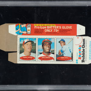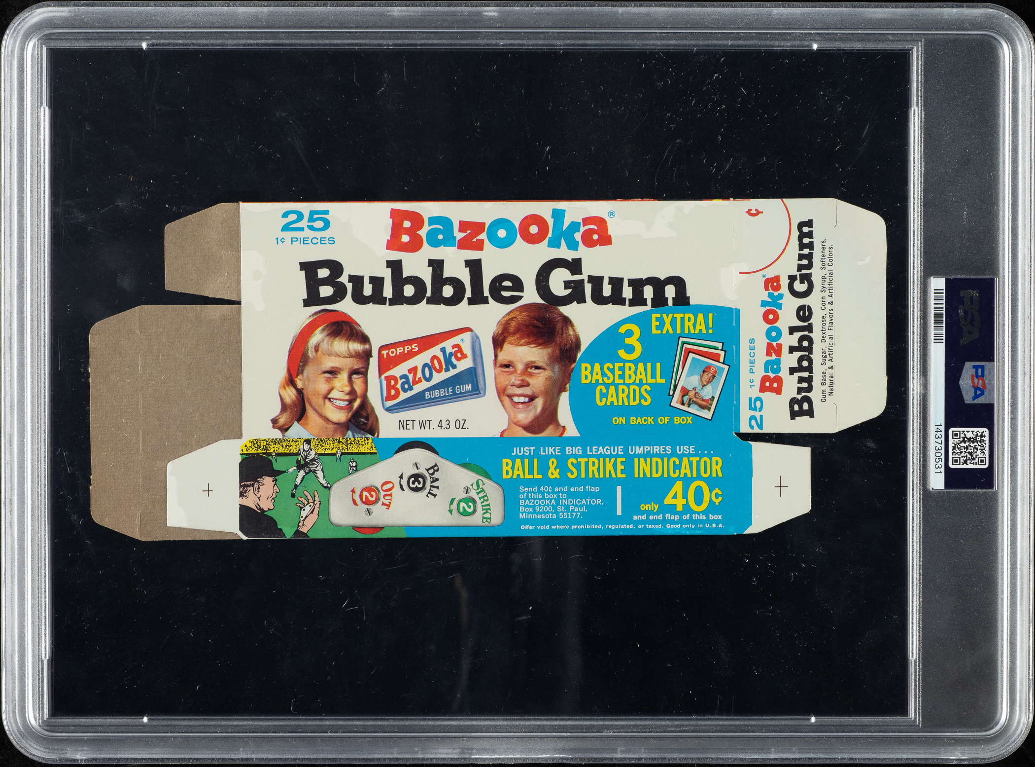 Graded MINT 9 by PSA. Original 1971 Bazooka Unnumbered complete box with Rusty Staub (Montreal Expos), Hall of Famer Bob Gibson (St. Louis Cardinals), and Amos Otis (Kansas City Royals). This is one of only two examples graded at this level by PSA with none higher!