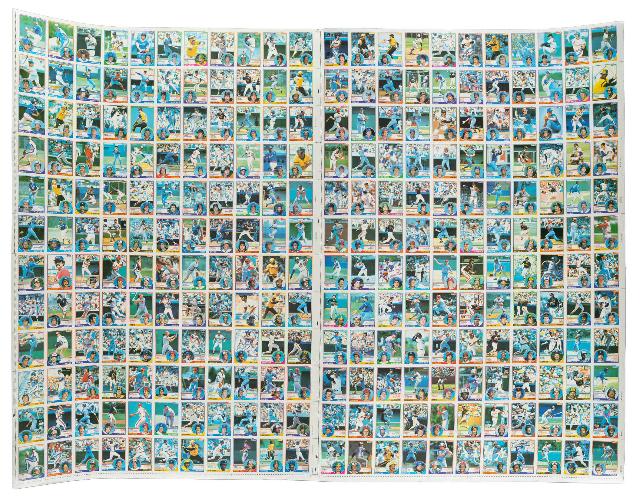 1983 Topps uncut double proof sheet with 264 cards, featuring many stars and Hall of Famers. The sheet is especially unusual in that it is blank backed but in all other respects is identical to a final production sheet. Highlights include Ryne Sandberg's rookie, Rickey Henderson, Reggie Jackson, Pete Rose, and George Brett. This 264-card "Jumbo" sheet measures 57 x 43 inches. Because of the large size, it is susceptible to minor imperfections. The sheet has various condition flaws such as minor creases, as well as light edge and corner wear. This sheet is very bright, crisp, and extremely impressive, and could easily be cut down into two standard 132-card sheets. Assigning an overall grade to uncut sheets, especially one of this impressive size, can be extremely difficult. Many of the interior cards on this sheet would grade Near Mint. It remains a very impressive and outstanding uncut sheet worthy of any advanced Topps collection. Please note: This sheet has been stored rolled and will be shipped as such. The size/weight of this item requires that there will be an additional shipping charge for this lot.