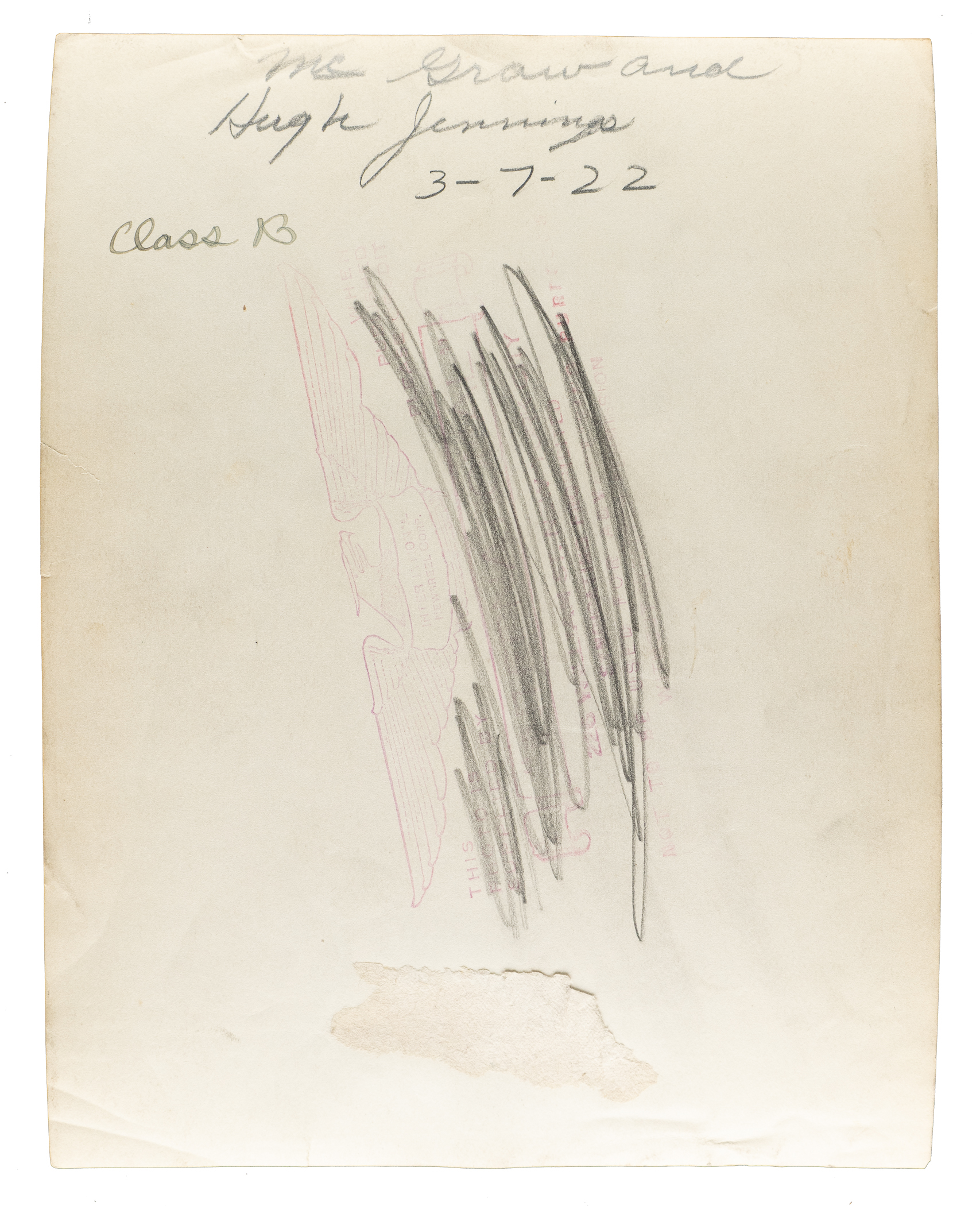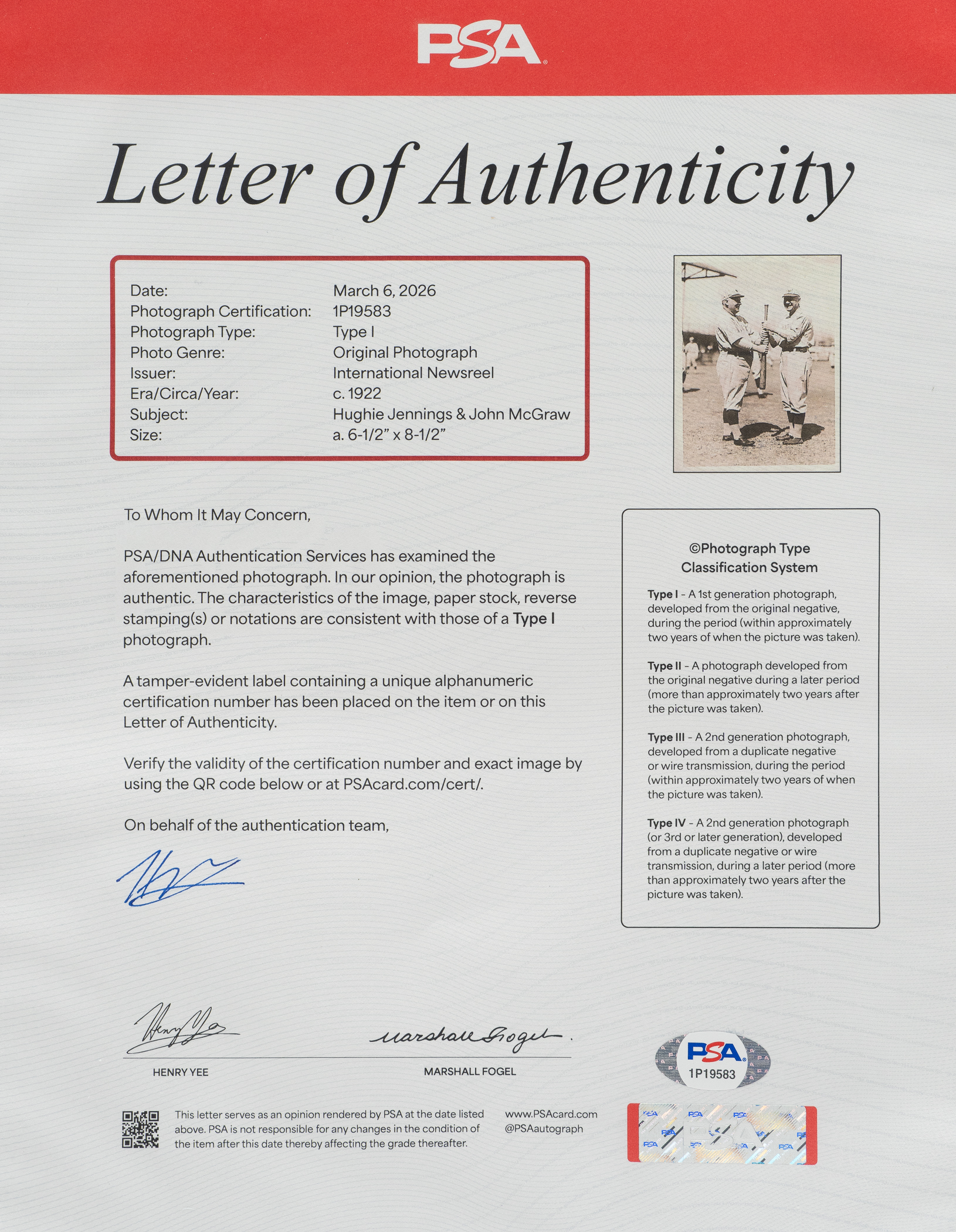 Original news photo capturing Hall of Famers Hughie Jennings and John McGraw posing together on the field as members of the New York Giants. Jennings served as a coach for legendary manager John McGraw during the 1922 season. This photo was taken during spring training in Marlin, Texas. Certified as an original Type I photograph by PSA/DNA. A "International Newsreel" credit stamp appears on the reverse. The original paper news caption is detached from the reverse. The handwritten notation in pencil on the reverse reads "McGraw and Hugh Jennings / 3-7-22 / Class B." The photo (6-1/2 x 8-1/2 inches) has light creasing. In Very Good condition overall. Full LOA from PSA/DNA.