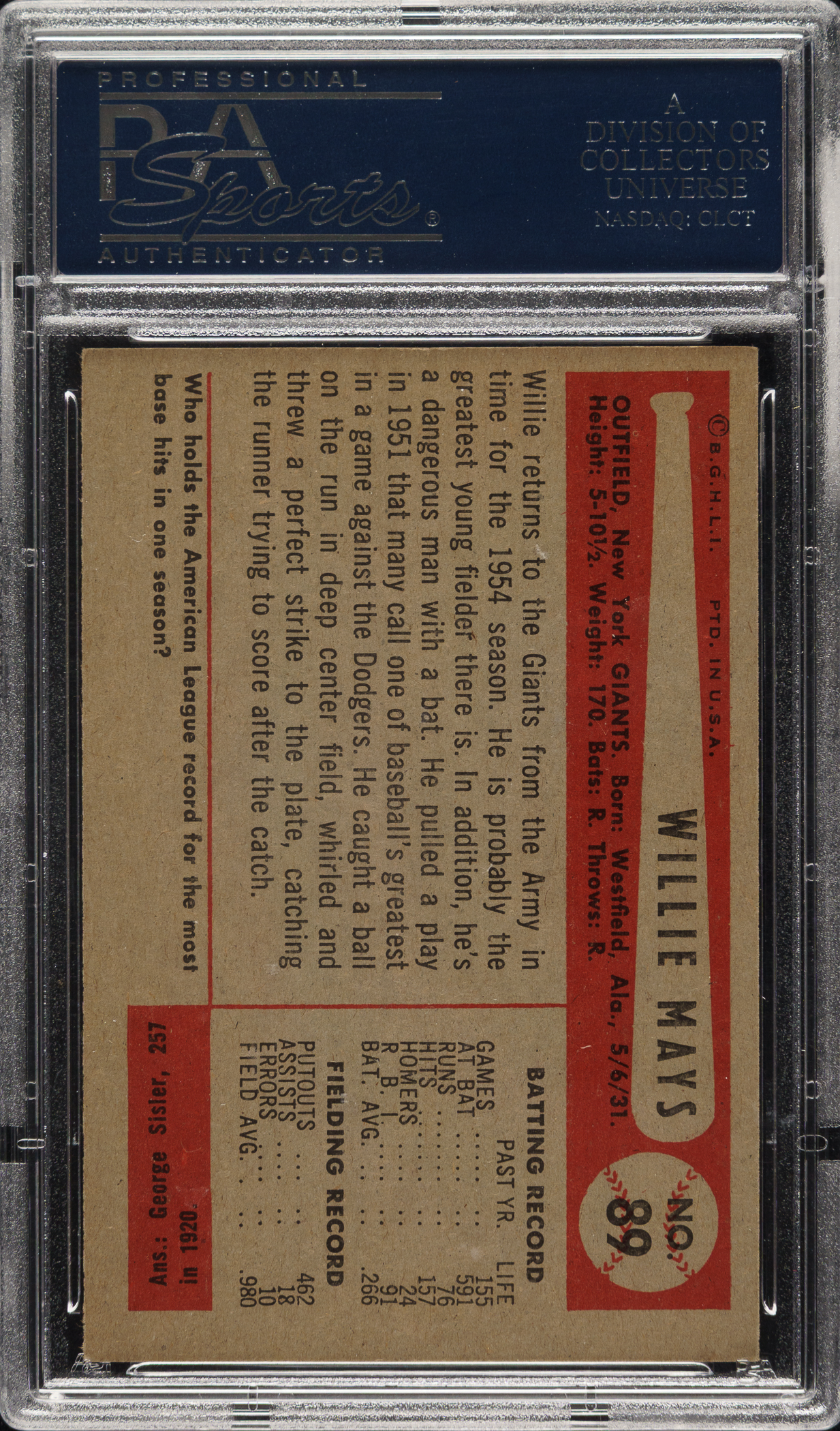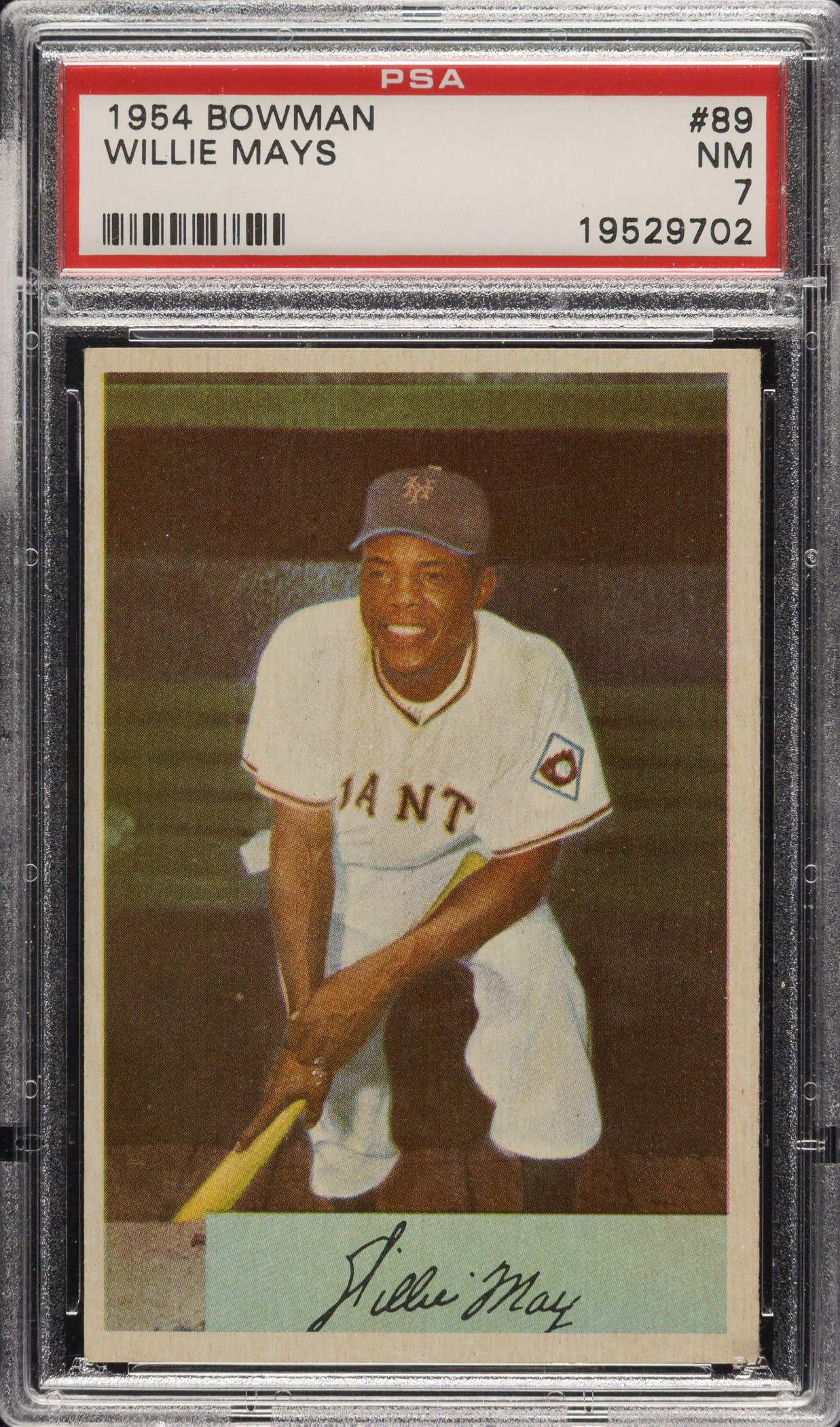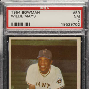 Graded NM 7 by PSA. High-grade example of this classic 1950s bubble-gum card of New York Giants Hall of Famer Willie Mays. The card exhibits beautiful colors, strong corners, and a clean reverse. This is a fantastic high-grade example of one of the most popular of all Willie Mays cards and one of the classic 1950s bubble-gum cards.