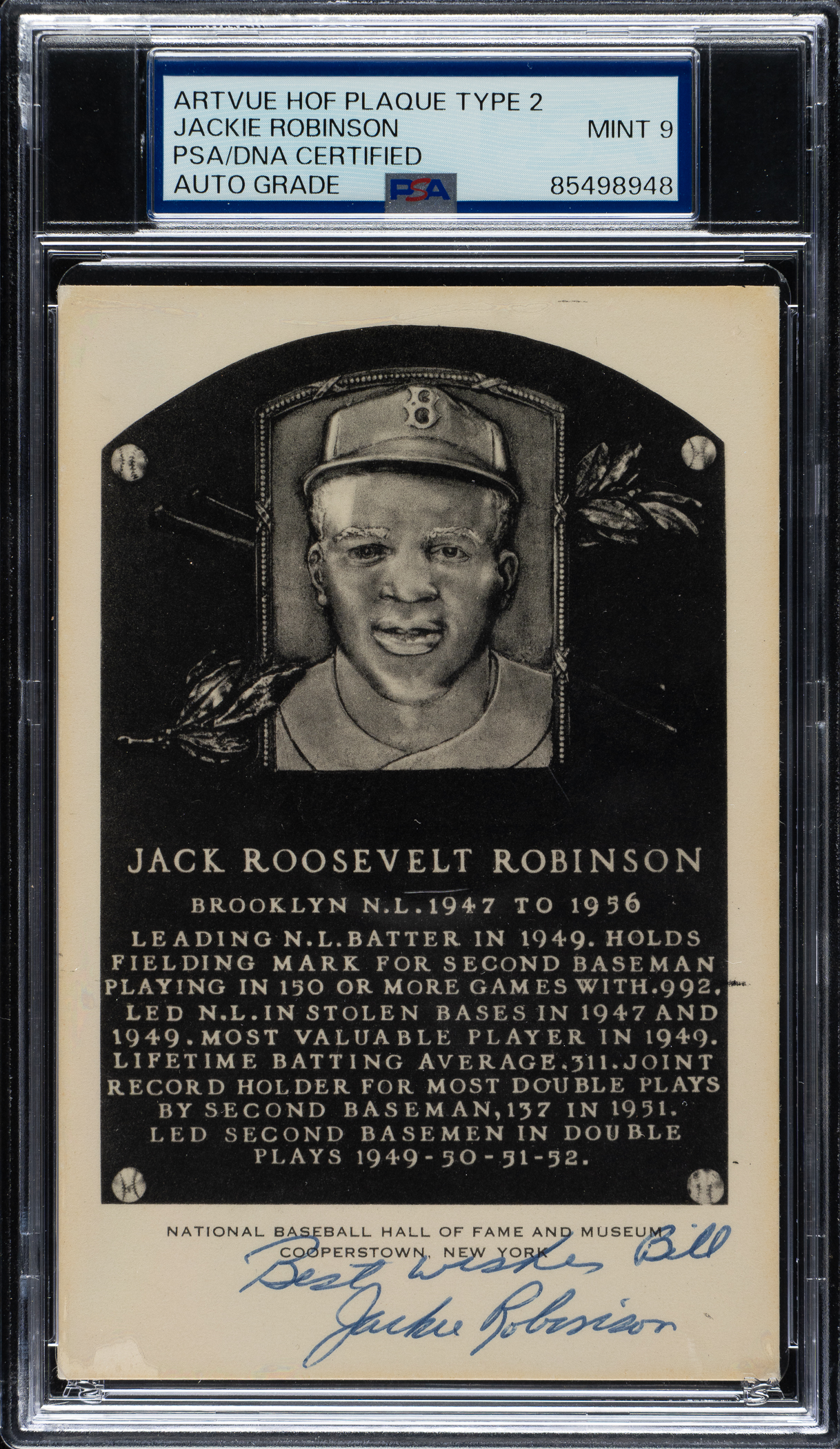 Black-and-white Hall of Fame postcard (Artvue Type 2) signed by Jackie Robinson. PSA/DNA has encapsulated the card and graded the signature MINT 9. Robinson has inscribed the card in blue ink along the base, "Best Wishes Bill/Jackie Robinson." The card (3.5 x 5.5 inches) presents in Very Good to Excellent condition.