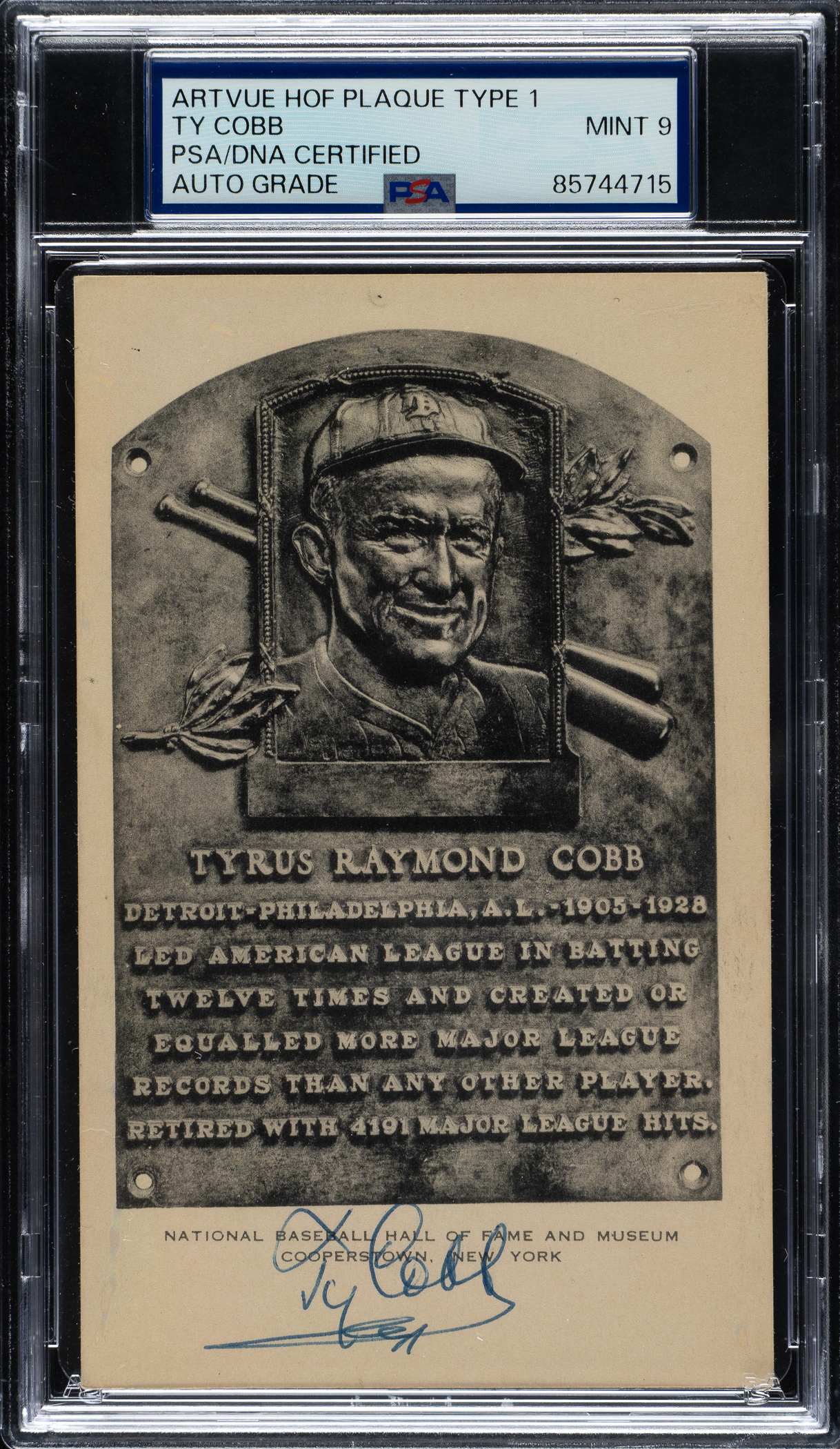 Black-and-white (Artvue Type 1) Hall of Fame postcard of Ty Cobb signed in blue ink on the front. PSA/DNA has encapsulated the card and graded the signature MINT 9. Cobb, along with Ruth, Wagner, Alexander, and Eddie Collins, is one of the keys to a complete set of autographed black-and-white Hall of Fame postcards. The postcard (3.5 x 5.5 inches) presents in Very Good condition.