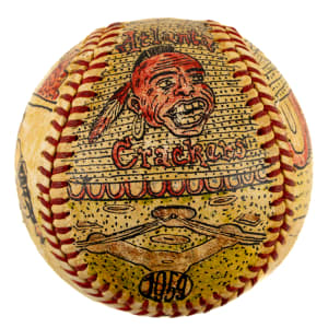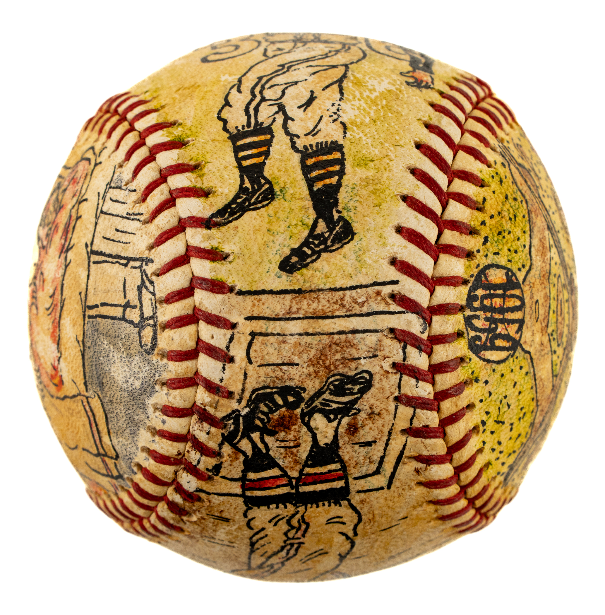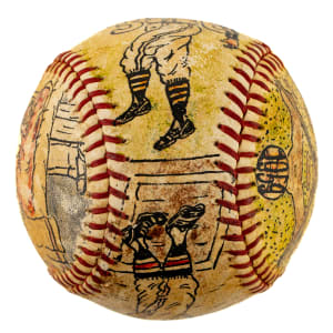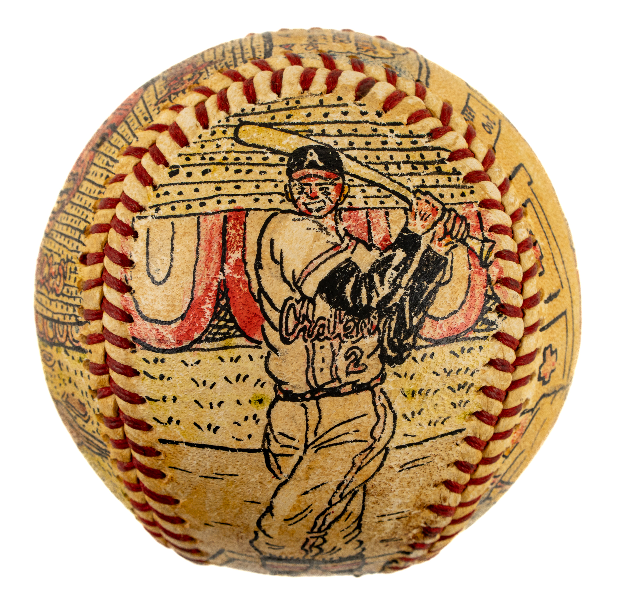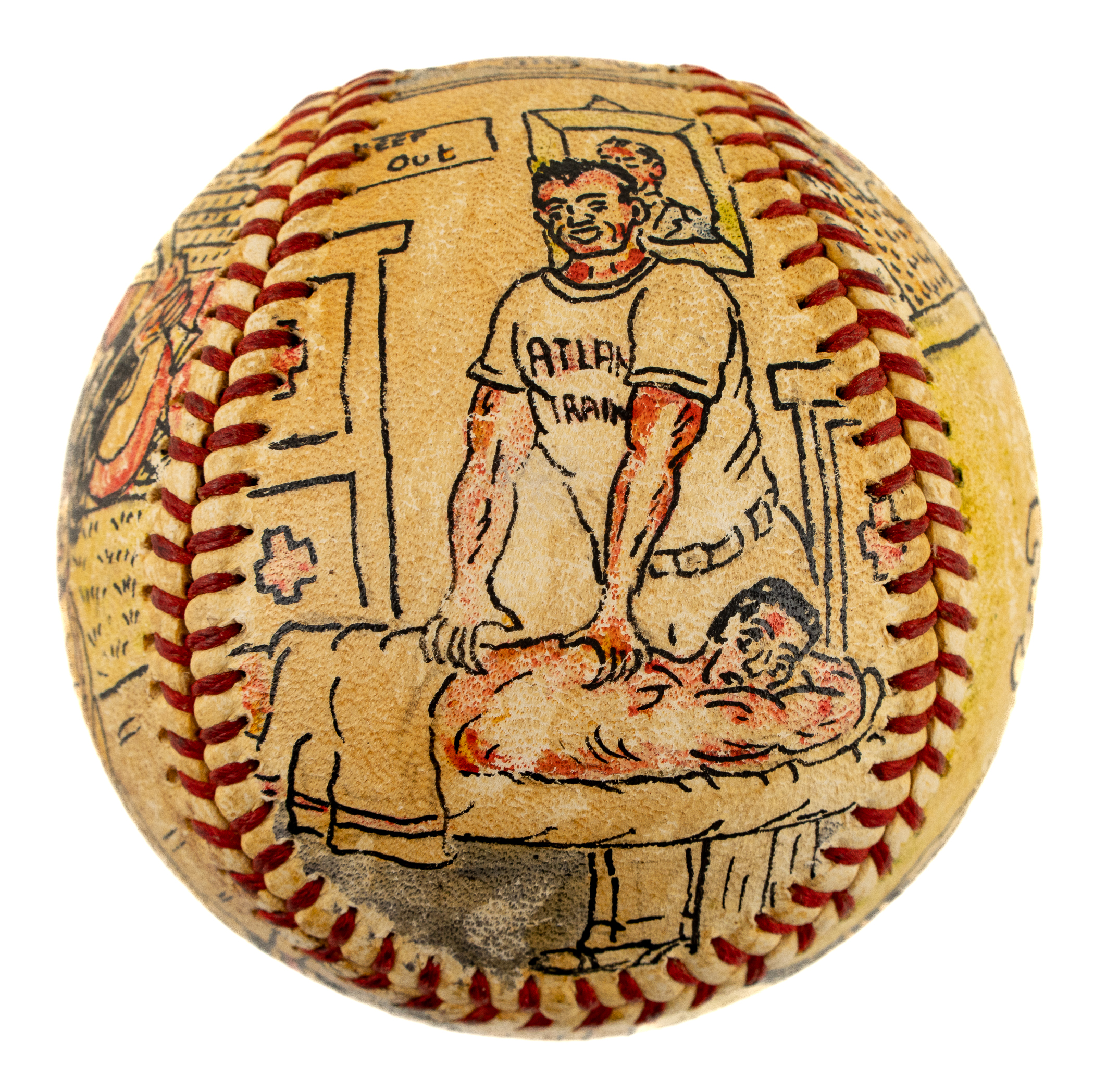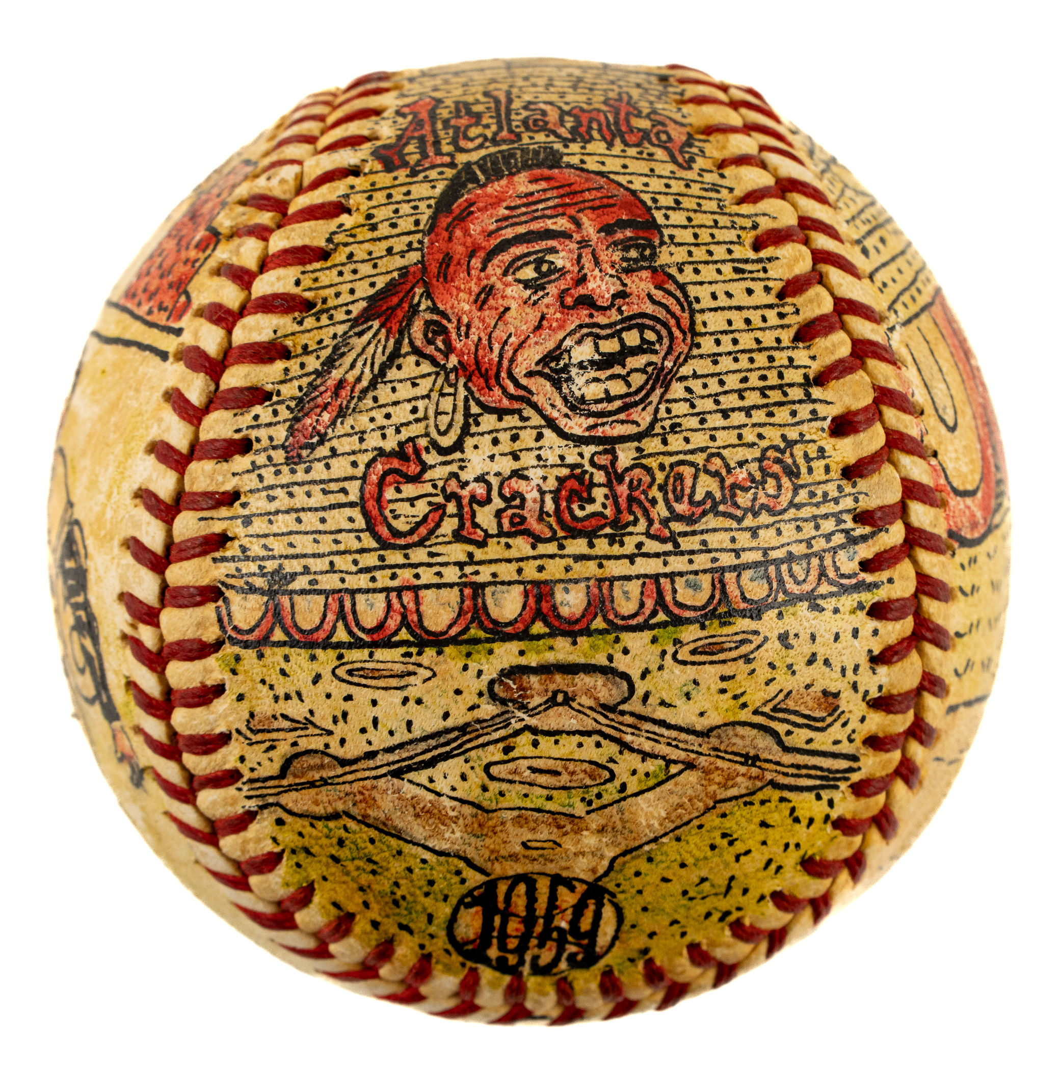Elaborate folk-art tribute ball, hand-painted by former minor-league umpire George Sosnak (1922-1992), commemorating the Atlanta Crackers, one of the most successful minor league clubs of all time. Illustrations paying tribute to the club adorn all the panels. Sosnak is nearly as well known in the folk-art community as he is in the field of baseball collectibles, so it is no surprise that examples of his work can be found in both the Baseball Hall of Fame in Cooperstown, New York, and the American Folk Art Museum in New York City. One of Sosnak's balls (detailing JFK's Opening Day pitch at a 1962 Senators game) can even be found in the John F. Kennedy Presidential Library. The ball displays several surface abrasions and is in Very Good condition overall.