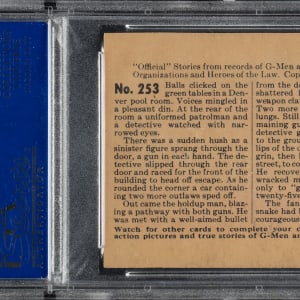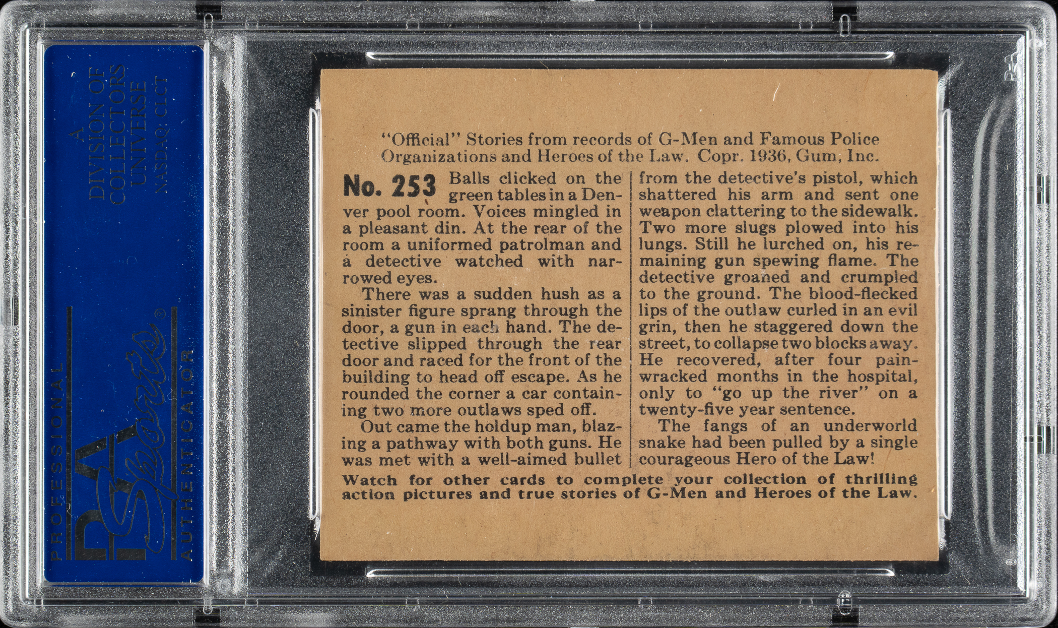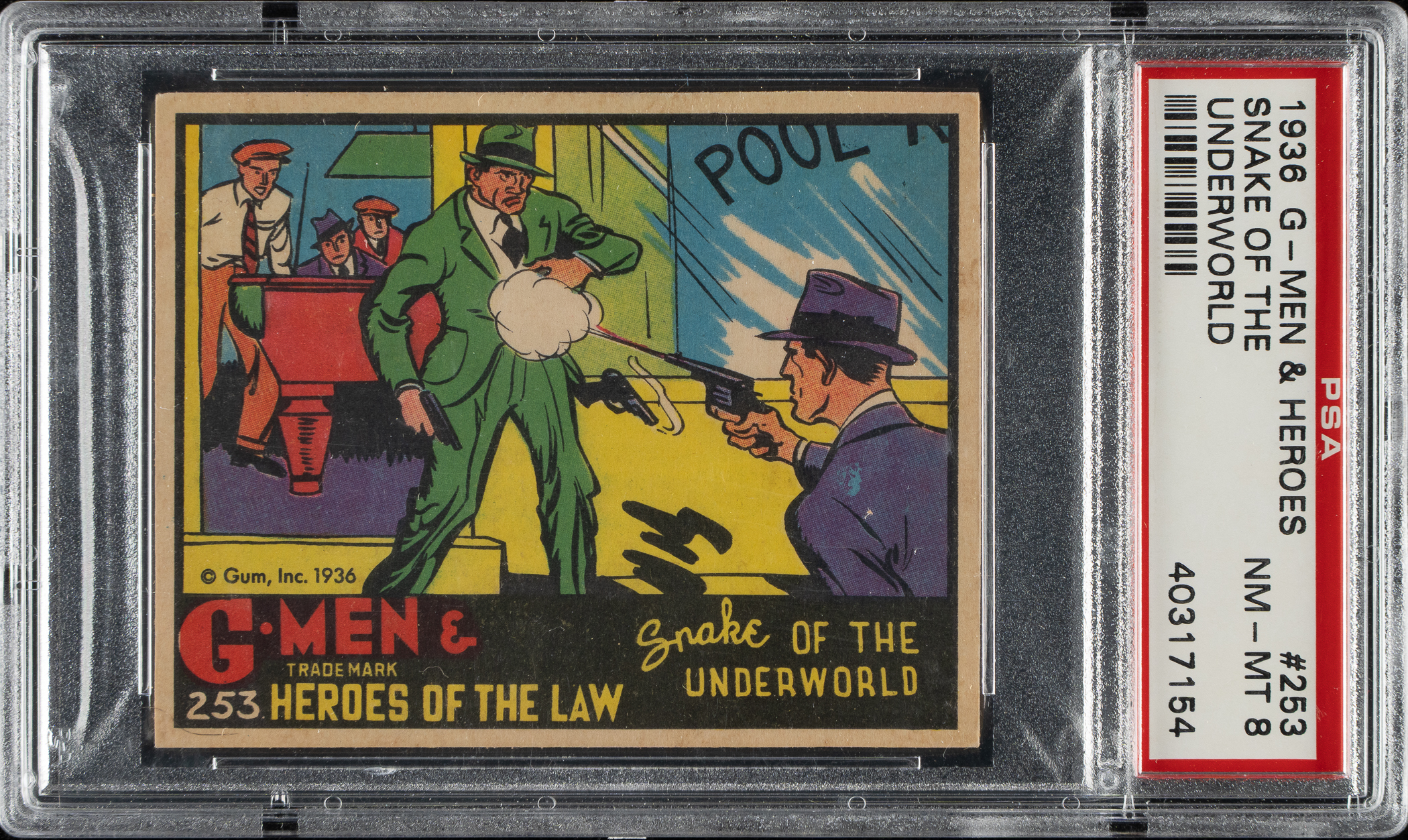 Graded NM-MT 8 by PSA. One of only four examples graded at this level by PSA with none higher! Gum, Inc.'s "G-Men & Heroes of the Law" set is one of nonsport-card collecting's all-time classic sets, presenting exciting "official stories" about "G-Men and Famous Police Organizations and Heroes of the Law." These cards chronicle law enforcement adventures in an era that glamorized, at times, both the representatives of law enforcement and the criminals. Advanced collectors are well aware that "G-Men" cards are far more difficult to collect in high grade than baseball cards of the era, in part because they are far rarer. In fact, less than four percent of all "G-Men" cards graded by PSA have been evaluated as NM-MT or higher.