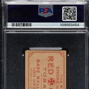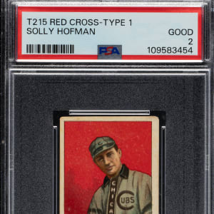 Graded GOOD 2 by PSA. One of only two copies graded by PSA, this is the highest-graded example! Extremely rare example of Solly Hofman (Chicago Cubs) from the 1910-1912 T215 Red Cross Tobacco (Type 1) set. T215 Red Cross is one of tobacco-card collecting's most overlooked issues. Very similar in design to and borrowing images from the T206 set, T215 Red Cross cards are thought to have been issued exclusively in the Louisiana area. The cards measure 1-1/2 x 2-5/8 inches, which is the standard size for tobacco issues. The offered card has vibrant colors, outstanding registration, and honest corner wear. The reverse exhibits bold and crisp print, an ideal quality for an example of this scarce issue. An unobtrusive crease above Hofman's cap contributes to the assigned grade. An outstanding sample from this scarce and desirable issue.