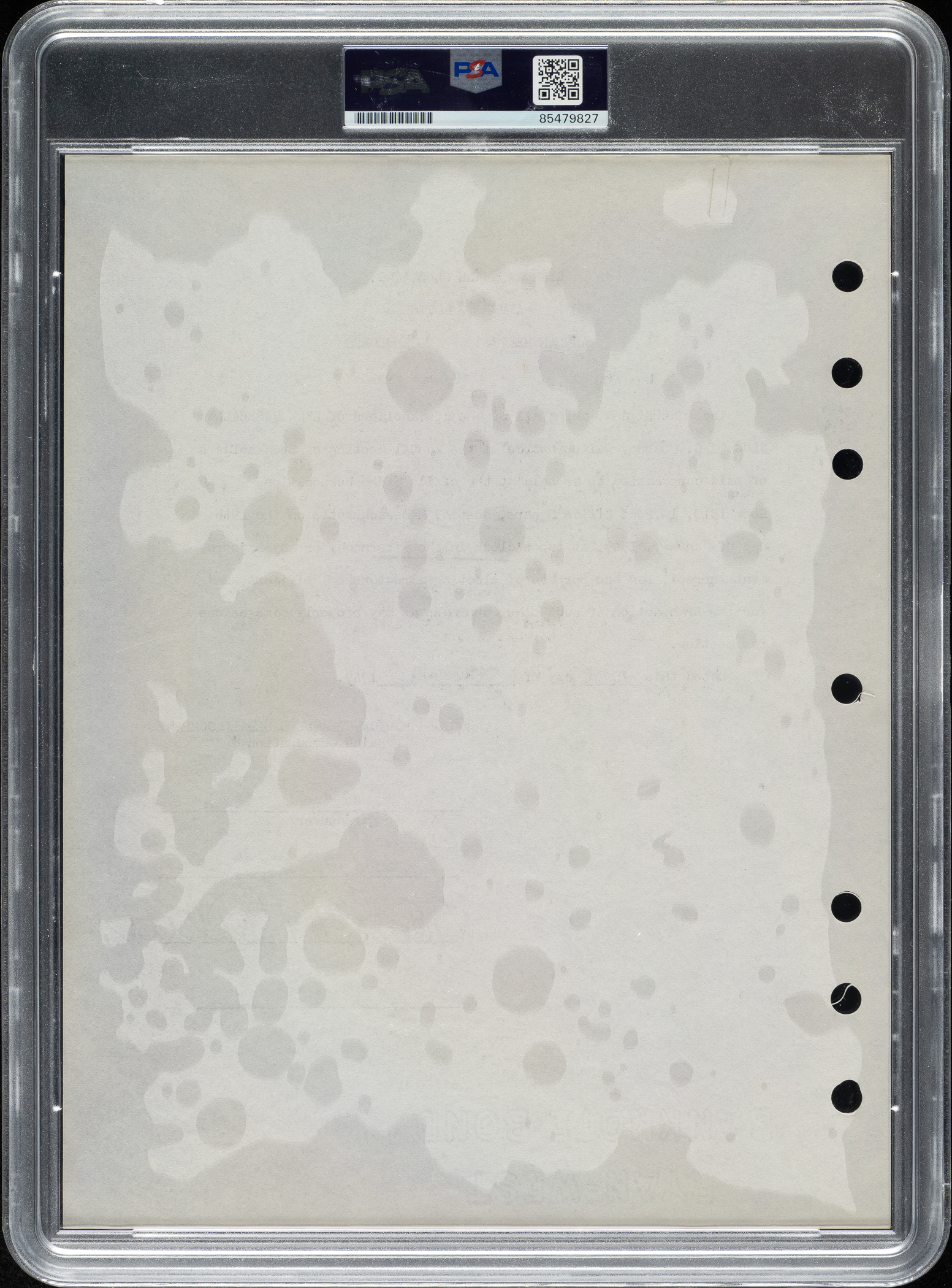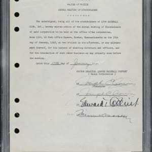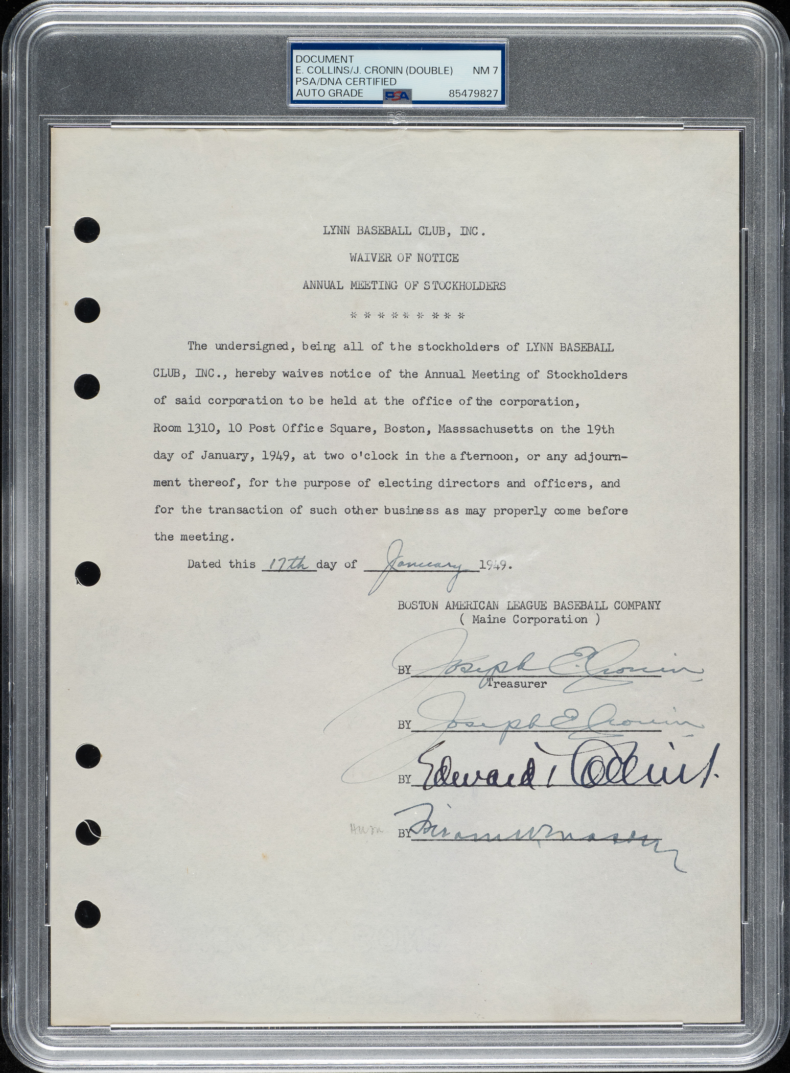 Document page dated January 17, 1949, taken from a Lynn Baseball Club Inc., company minute book (titled "Waiver of Notice") signed twice by Joe Cronin in his role as Treasurer of the Boston Red Sox and once by Eddie Collins. PSA/DNA has encapsulated the document and graded the signatures NM 7. The document (8.5 x 11 inches) displays seven notebook holes and is in Excellent condition overall.