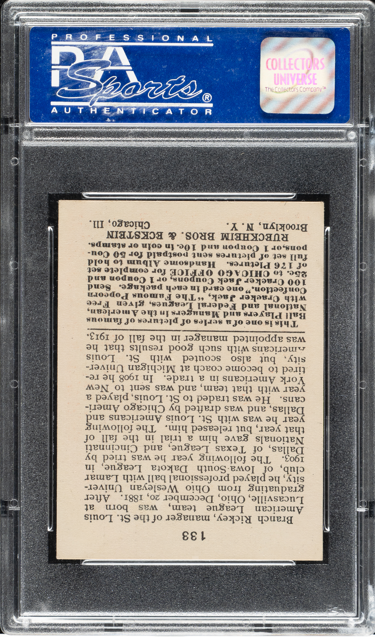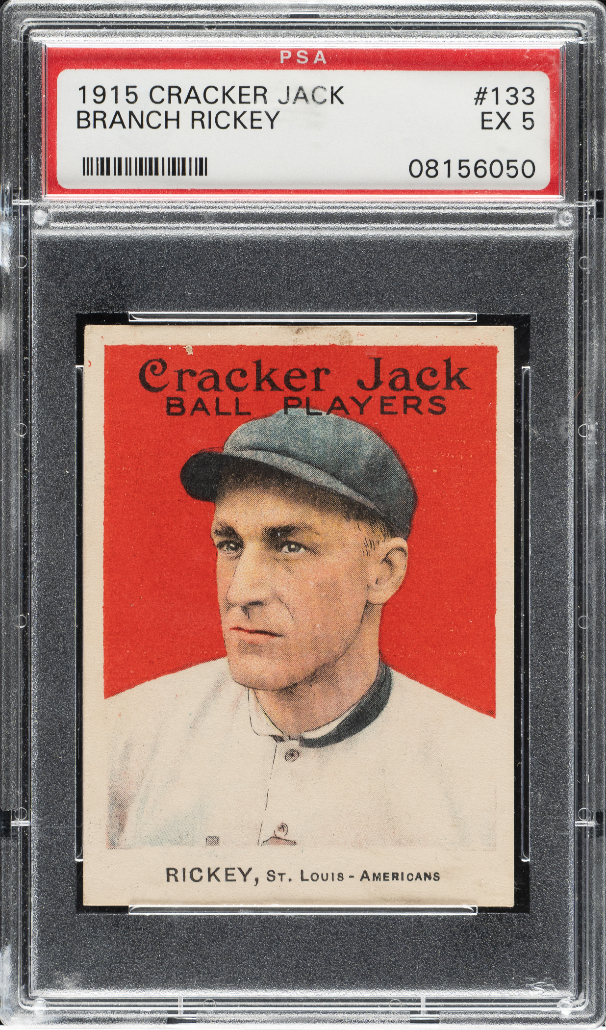 Graded EX 5 by PSA. Hall of Famer Branch Rickey (St. Louis Browns) from the 1915 Cracker Jack series. This card has a bright red background, crisp image, light corner wear, and excellent centering. Clean reverse. A strong mid-grade example.