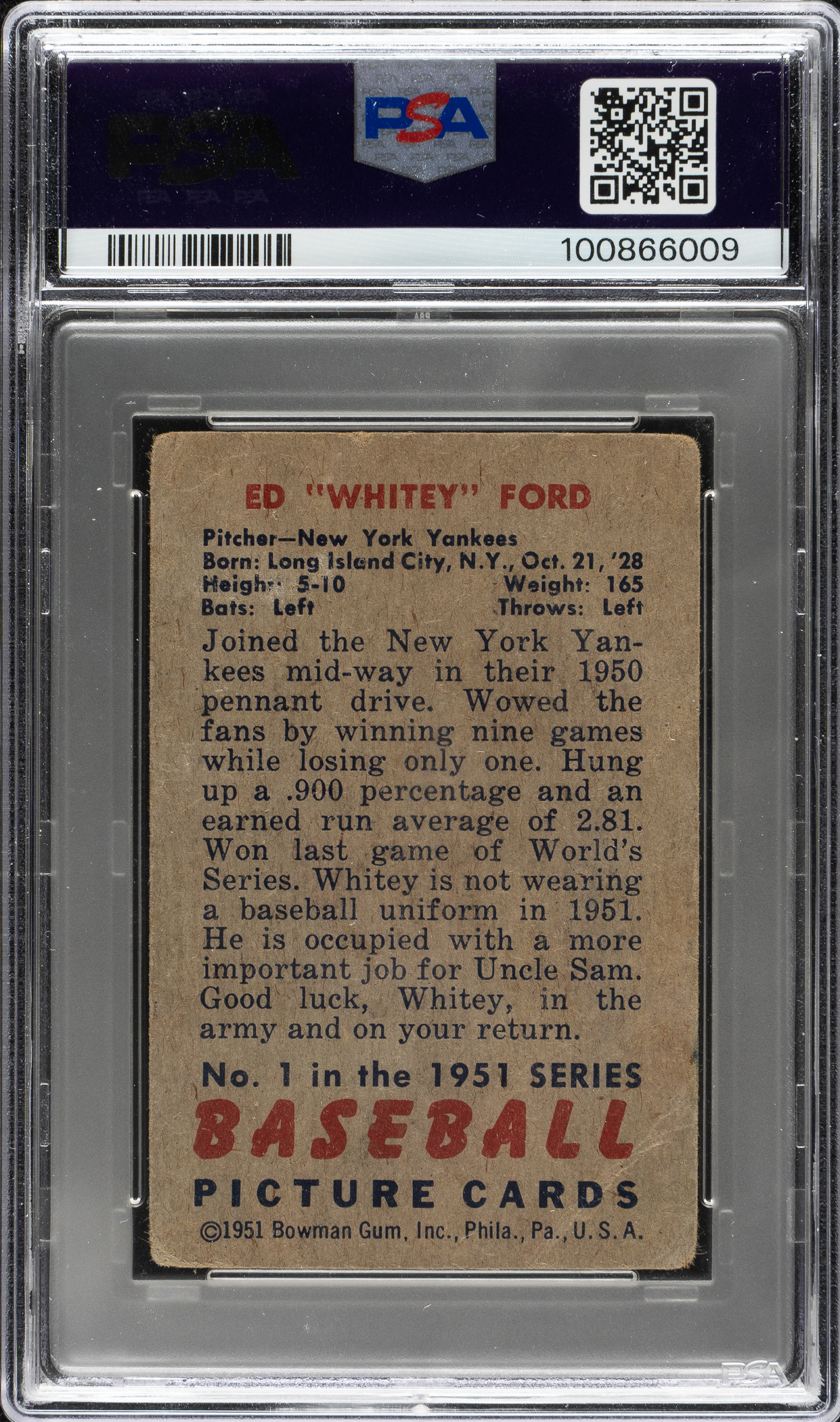 PSA/DNA has encapsulated the card, grading the signature MINT 9 and the card FAIR 1.5. New York Yankees Hall of Famer Whitey Ford.