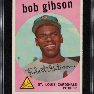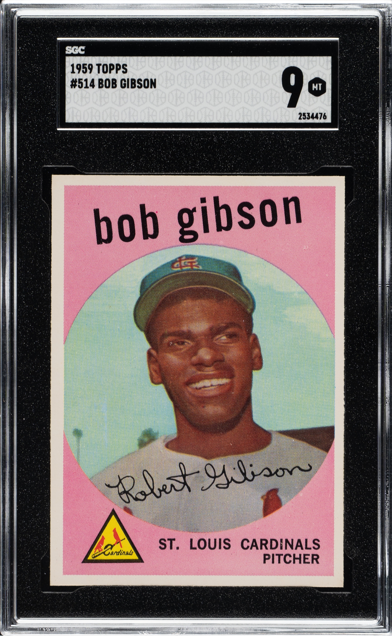 Graded MINT 9 by SGC. Out of the 2,703 examples SGC has graded to date, only one card has ever been graded higher. Striking ultra-high-grade rookie card of St. Louis Cardinals Hall of Famer Bob Gibson from the classic 1959 Topps set. This card boasts vibrant colors, a strong image, and sharp corners. Clean reverse. This is a tremendous card of the key rookie from this popular 1950s Topps set, which would make an outstanding addition to any complete set, Hall of Fame rookie card, or Bob Gibson collection.