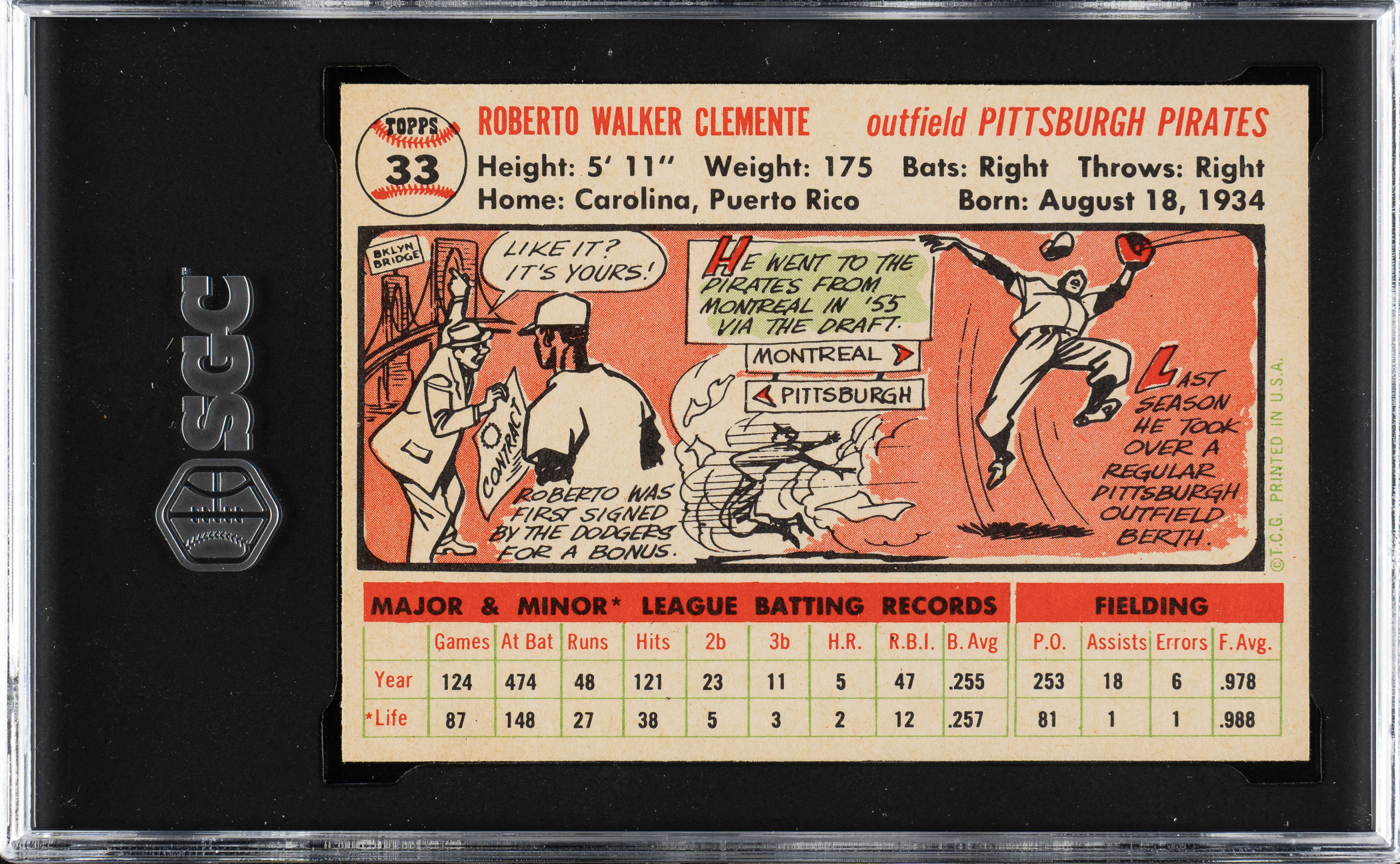 Graded MINT 9 by SGC. Of the more than 2,000 examples of this card SGC has evaluated to date, only four have achieved this grade, with none graded higher. Extraordinary example of Pittsburgh Pirates Hall of Famer Roberto Clemente from the classic 1956 Topps set. This card displays brilliant colors, outstanding contrast, four sharp corners, and incredible centering. The white back is entirely clean with bold printing. 1956 Topps cards typically suffer from a variety of condition problems, including print defects and a tendency to have soft corners, which make high-grade examples particularly difficult to find. This is an exceptionally attractive high-grade example of one of Roberto Clemente's most classic cards from one of the 1950s most popular sets.