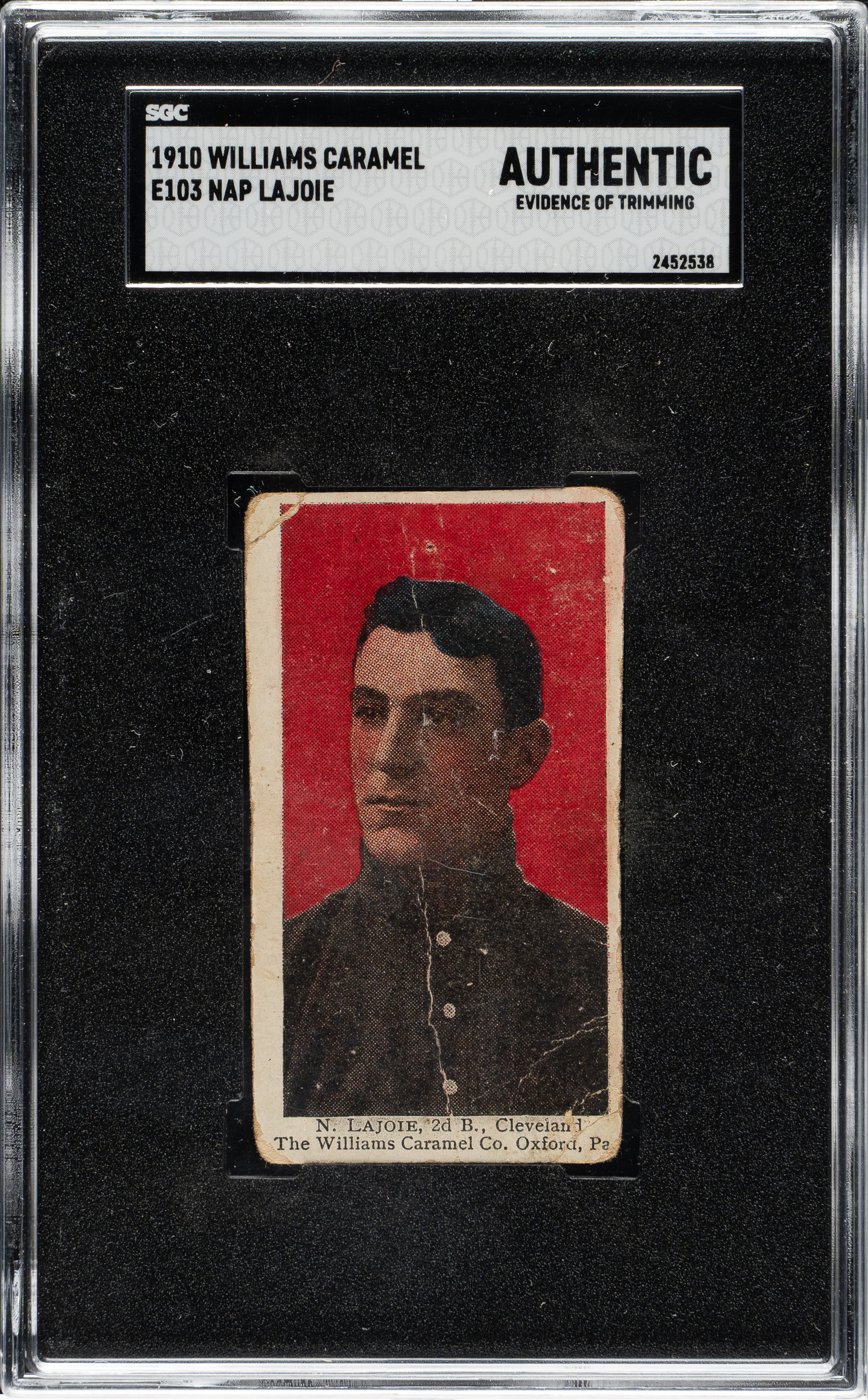 Classic example of Cleveland Naps Hall of Famer Nap Lajoie from this very rare and classic 1910-era candy set. The E103 Williams Caramel set is easily distinguished from other caramel sets of the era by the bright red background highlighting each player's portrait. As noted on each card along the lower margin, the Williams Candy Company was located in Oxford, Pa., and this candy was very likely issued on a somewhat regional basis. This fact almost certainly accounts for their great rarity. When they are found, they usually have serious condition problems, which is not surprising considering that these cards were issued to children, one card per package of candy. The offered card has bold colors, a crisp image of Lajoie, and scattered creasing. Encapsulated as "Authentic" by SGC due to evidence of trimming. Despite the flaws, this remains a presentable example of one of Lajoie's most desirable cards.