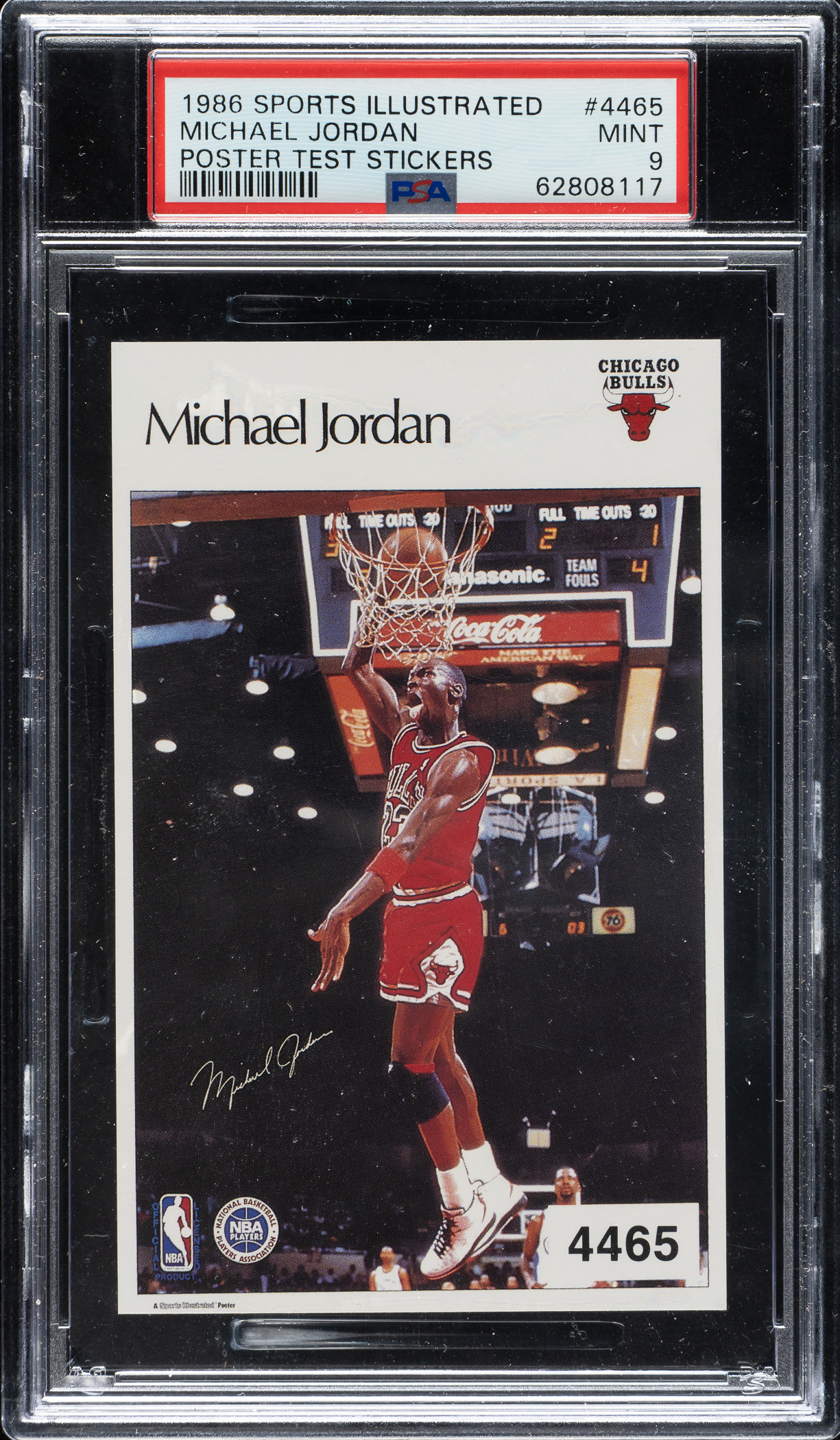 Graded MINT 9 by PSA. Highest-graded example! Outstanding example of Michael Jordan from the 1986-1987 Sports Illustrated Poster Test Stickers series. This example boasts vibrant colors, superb image quality, and sharp corners. The blank reverse is clean. This is a spectacular example of this desirable and rarely offered Jordan piece.