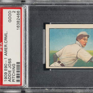 Graded GOOD 2 by PSA. Cleveland Naps Hall of Famer Addie Joss in the rare pitching pose from the highly desirable E90-1 American Caramel series. Similar to the Cracker Jack of Mathewson that was issued in two poses (though one in the #144 set and the other in the #176 set), Joss is a key Hall of Famer who has two poses in the E90-1 set. The horizontal pitching pose is incredibly rare and is one of the key extreme rarities of the entire E90-1 set. We believe the E90-1 horizontal pitching pose of Joss is rarer than even Joe Jackson in this set, and the PSA Population Report supports this theory very strongly: Only 43 rare Joss horizontals in all grades have ever been graded, versus a total of 107 Joe Jacksons.
