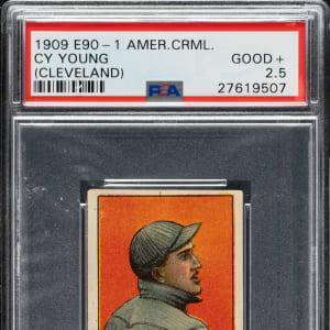 Graded GOOD+ 2.5 by PSA. Outstanding mid-grade example of Hall of Famer Cy Young from the E90-1 American Caramel series. Cy Young appears on two cards in this set: a portrait pose depicting him with Boston and a throwing pose depicting him with Cleveland, the latter of which is offered here. Each variation is among the most popular and classic of all cards of the legendary Cy Young. The offered card features a bold orange background, a crisp image of Young, and honest corner wear. Tiny spots of glue residue on the reverse contribute to the assigned grade. An outstanding opportunity to acquire a relatively affordable example of the classic Cy Young card from the most popular caramel-card set of the era.