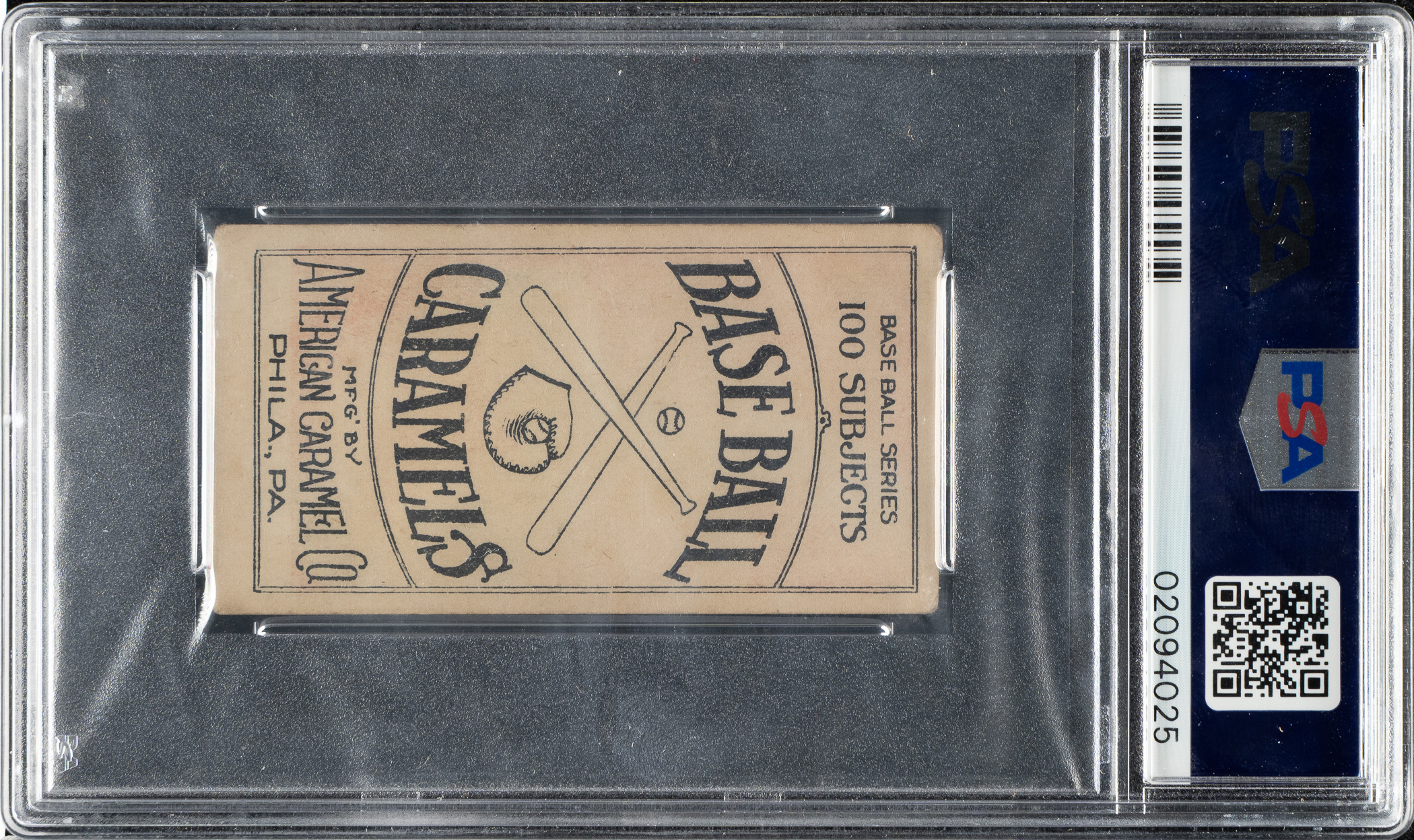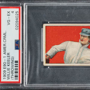Graded VG-EX 4 by PSA. Outstanding mid-grade example of Hall of Famer Willie Keeler (throwing) from the highly desirable E90-1 American Caramel series. This example boasts vibrant colors, a crisp image, and honest corner wear. Clean reverse with bold black text. A fantastic example of Willie Keeler, one of the key Hall of Famers from the most popular caramel-card set of the era.