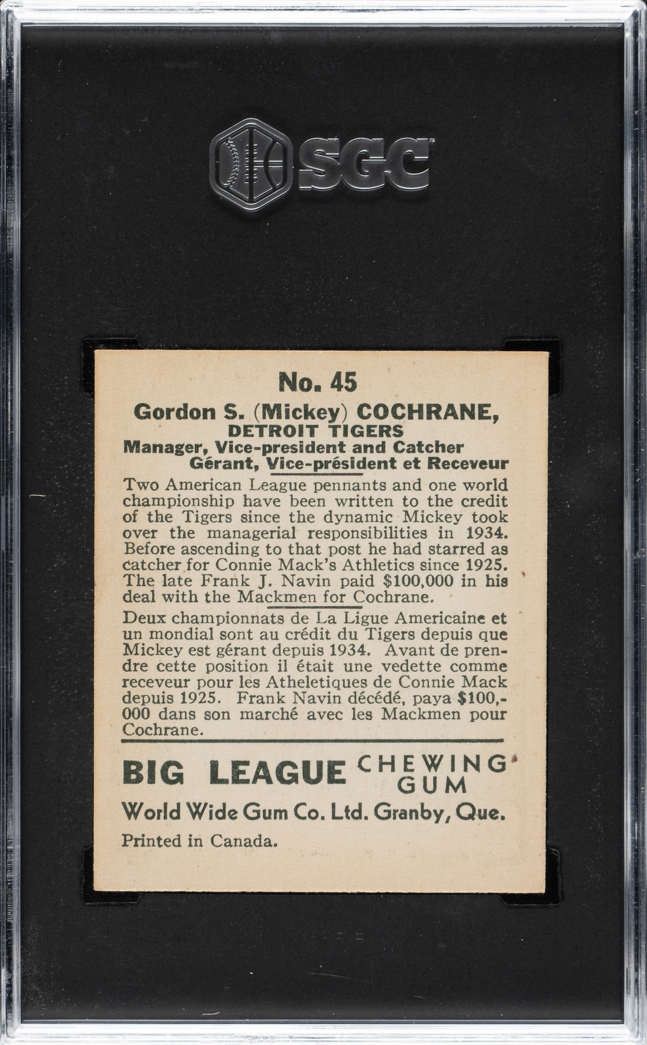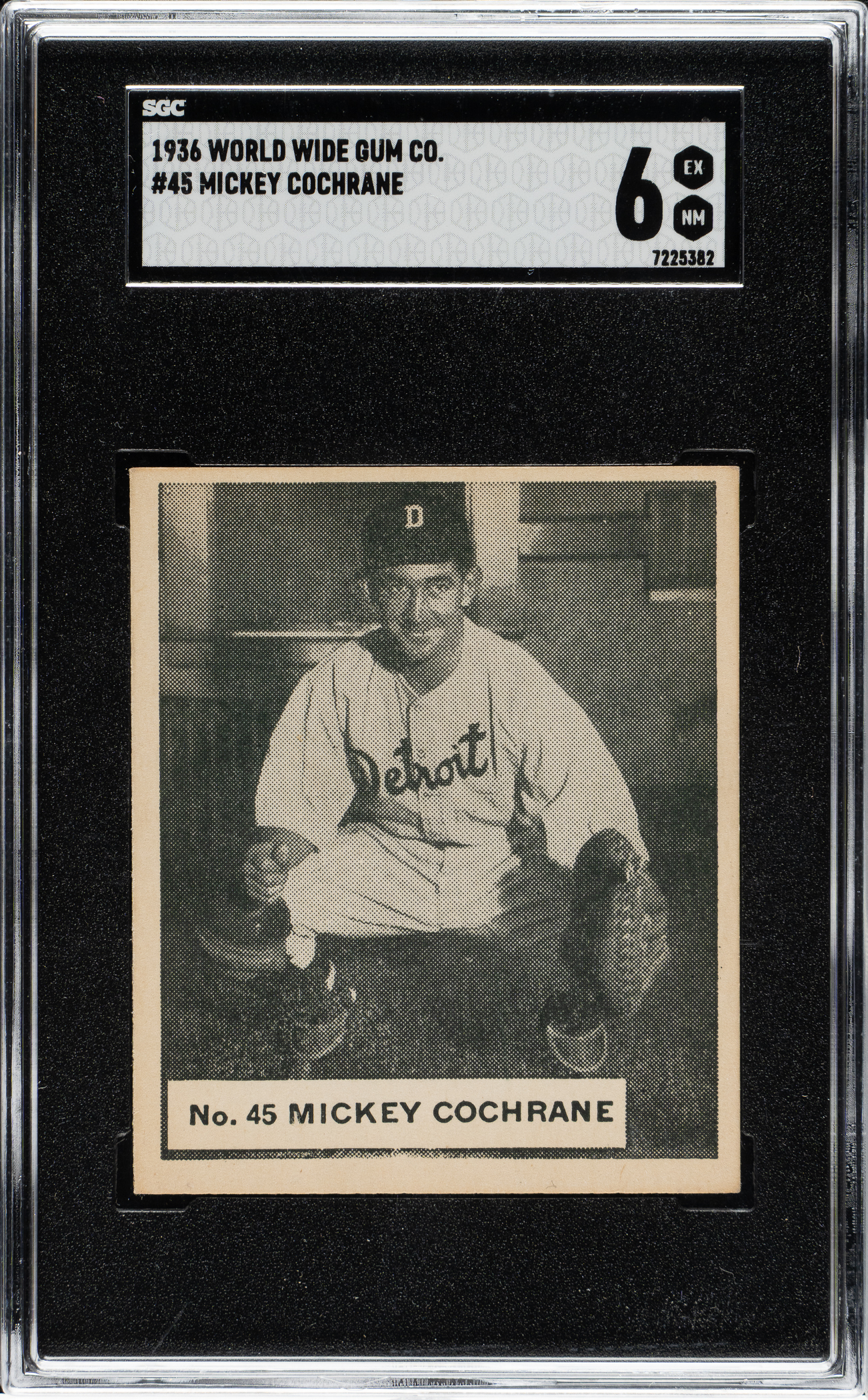 Graded EX/NM 6 by SGC. Detroit Tigers Hall of Famer Mickey Cochrane. One of two examples graded at this level by SGC with none higher.
