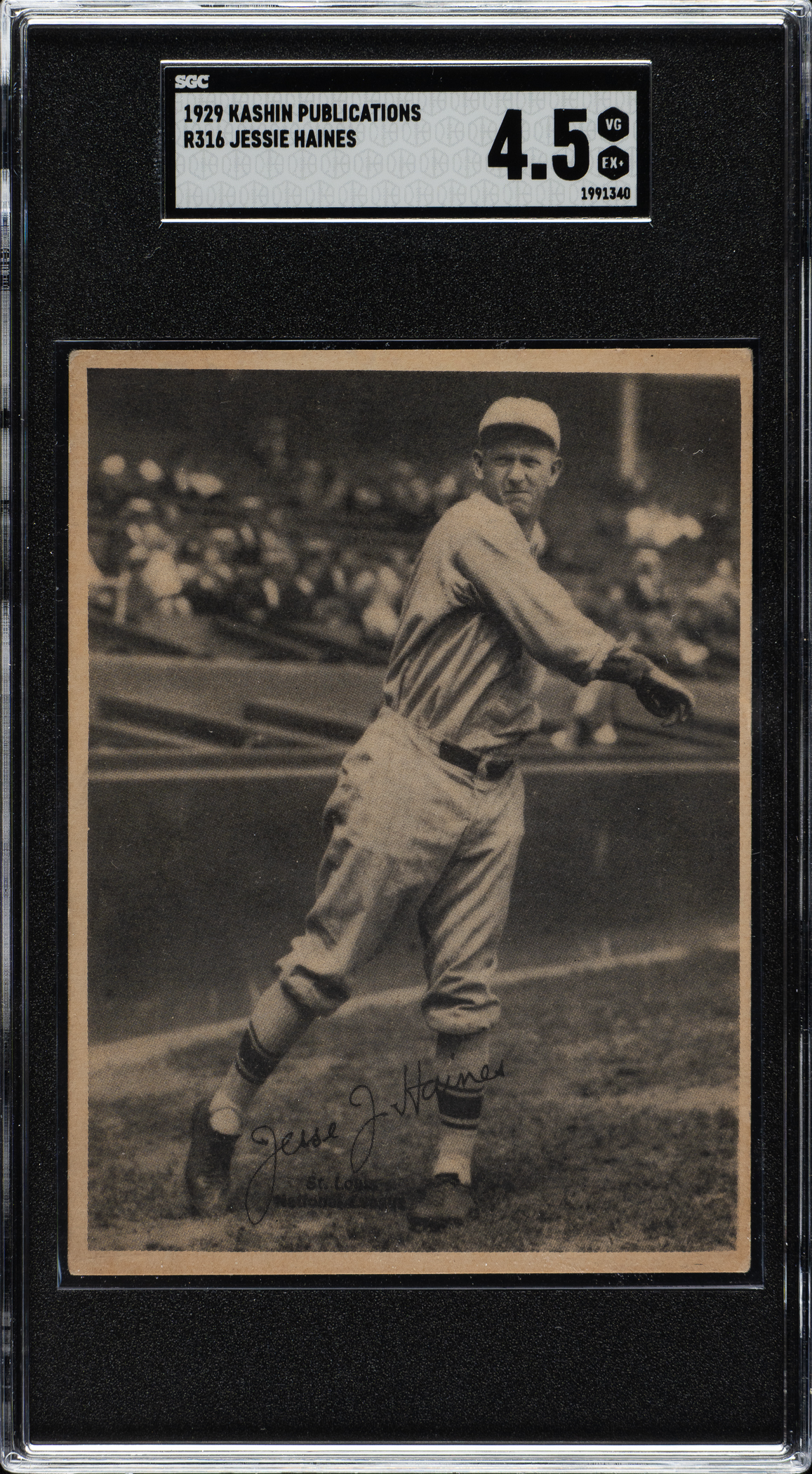 Graded VG/EX+ 4.5 by SGC. Only one example has been graded higher by SGC to date. Outstanding mid-grade example of St. Louis Cardinals Jesse Haines, one of the key rarities from the 1929 R316 Kashin Publication series. Haines is one of several extremely rare cards in the R316 set. When the R316 set was issued, they were sold in four series (25 cards per box, each box representing one of four series, for a total of 100 cards). In an effort to boost sales, the company issuing the set, Kashin Publications, decided they could get kids more excited by including a Babe Ruth card with each boxed series. To do this, instead of just adding an extra card, they replaced one card in each series with Ruth. While Ruth is the key card to the set, like card #144 Ruth in 1933 Goudey, it was actually printed in larger numbers than other cards in the set. Haines was one of the cards removed from distribution to accommodate "the Ruth sales strategy," making this card one of the true rarities of the R316 set. The offered card has superb image clarity and honest corner wear. The blank reverse is clean. A tremendous example of this R316 rarity.