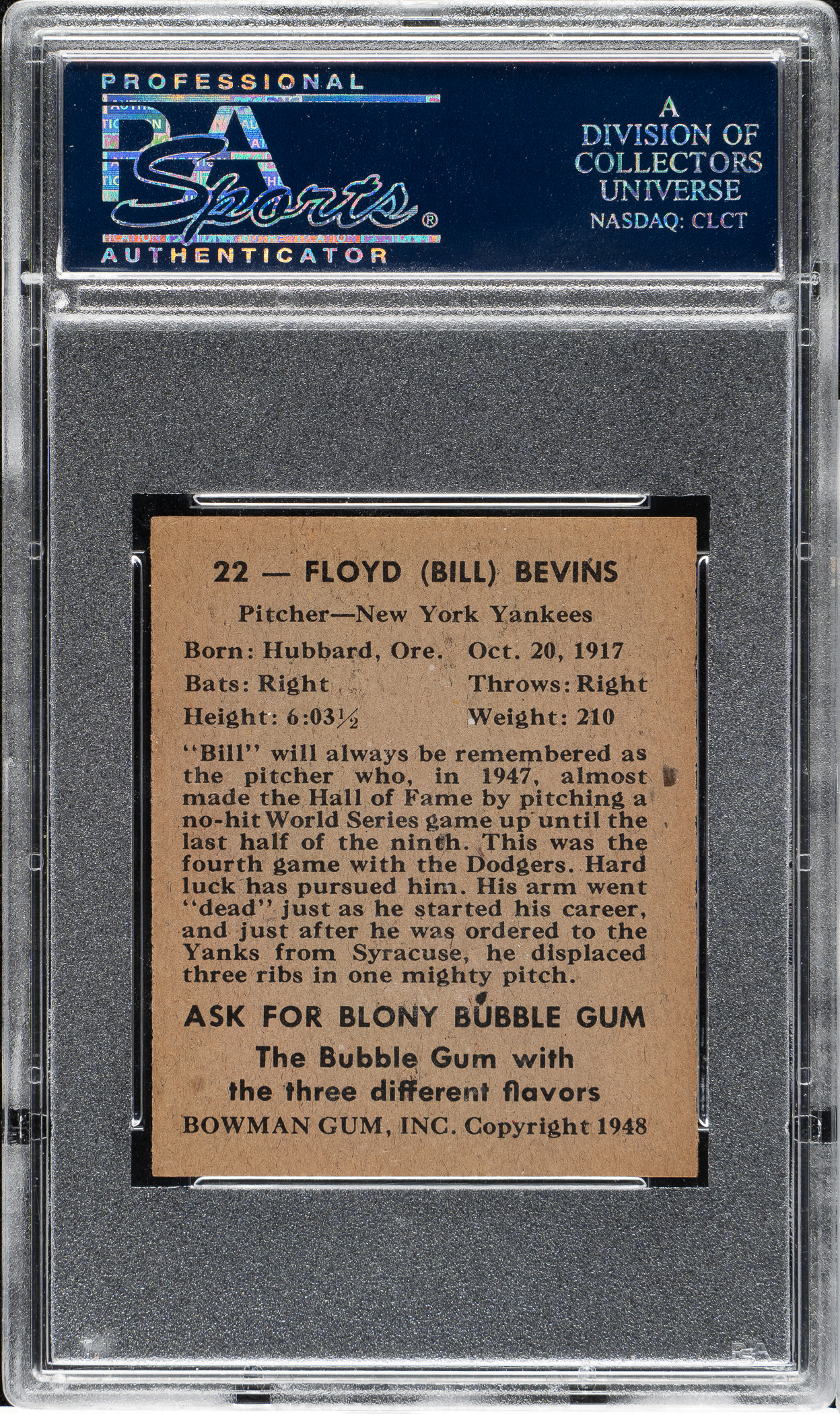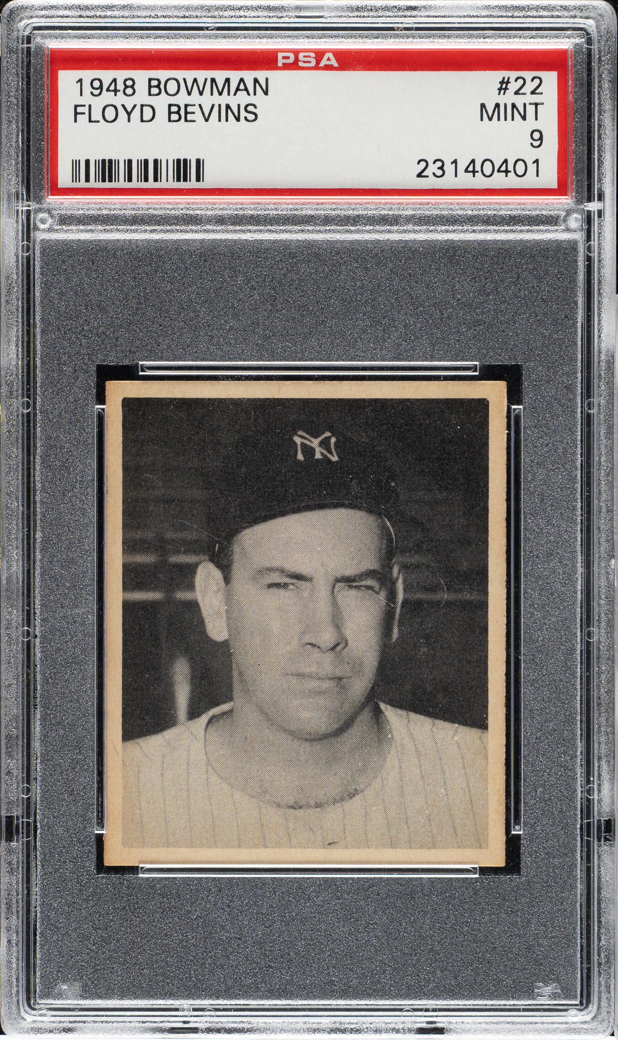 Graded MINT 9 by PSA. New York Yankees. One of only eight examples graded at this lofty level by PSA with none higher! It is interesting to note that his last name is misspelled as "Bevins" on this card.