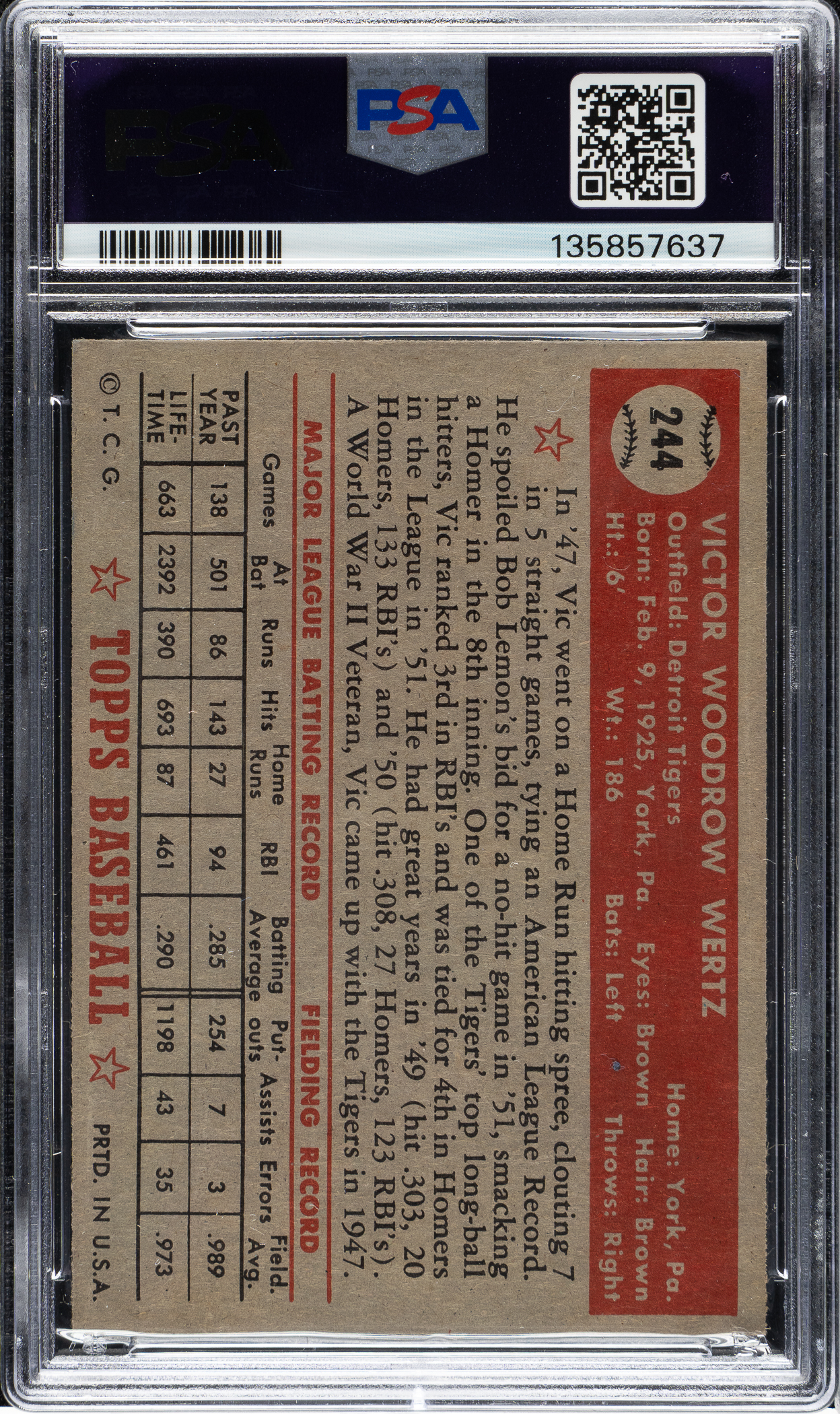 Lot # 3123: 1952 Topps #244 Vic Wertz PSA NM-MT 8