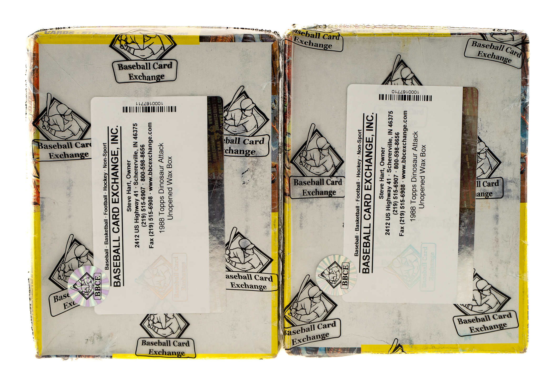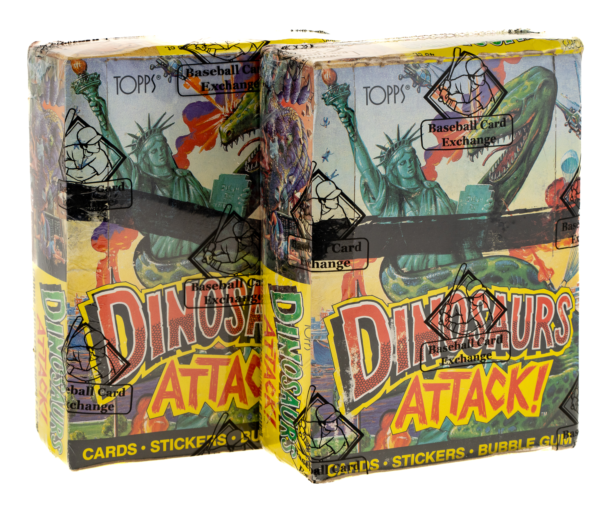 Pair of 1988 Topps "Dinosaurs Attack" wax boxes. Each box contains 48 packs for a total of 96 packs. Both boxes comes shrink-wrapped by Baseball Card Exchange (owned by Steve Hart, the foremost expert on unopened material).