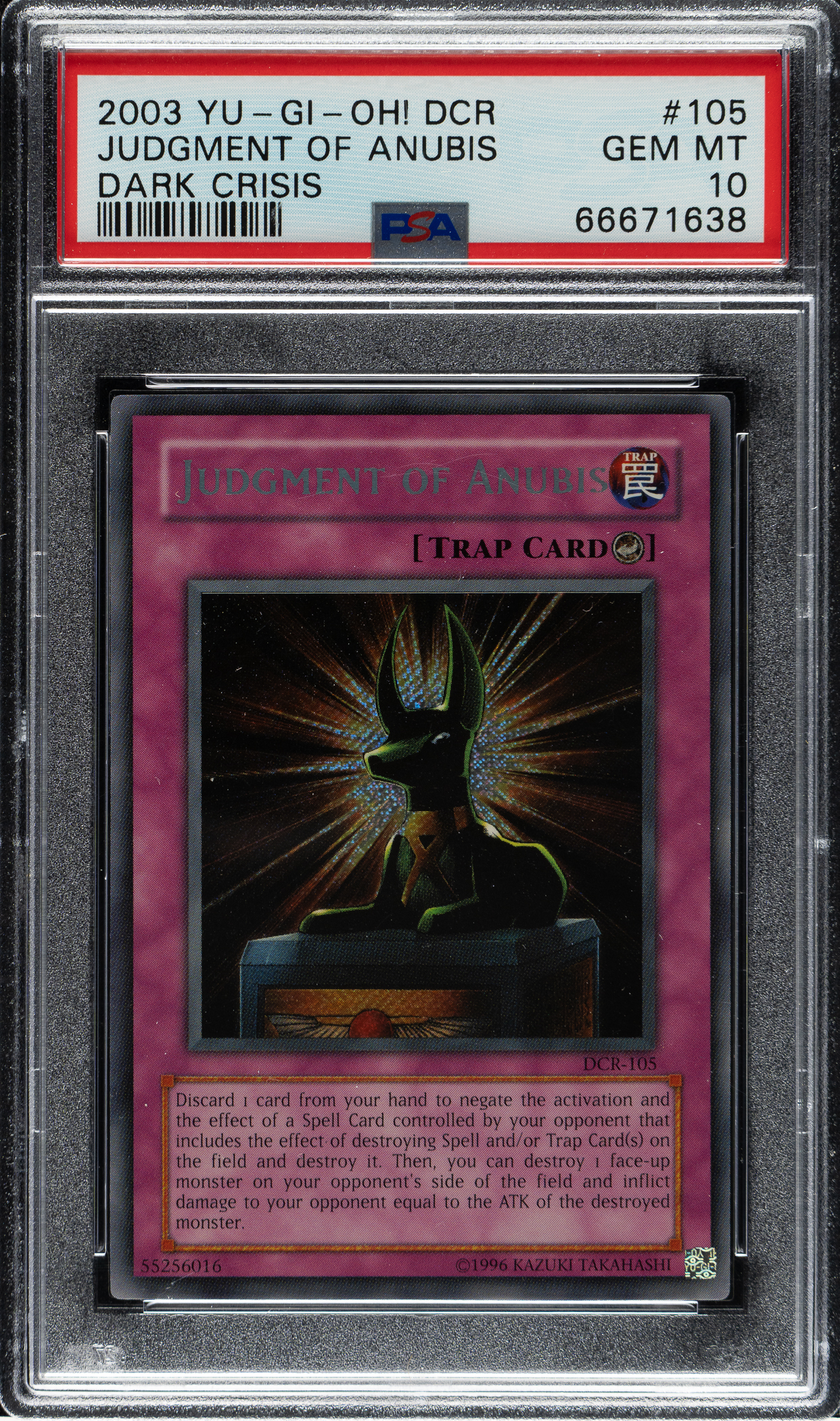 Lot # 3220: 2003 Yu-Gi-Oh! Dark Crisis #105 Judgement of Anubis Secret Rare Holographic PSA GEM MINT 10
