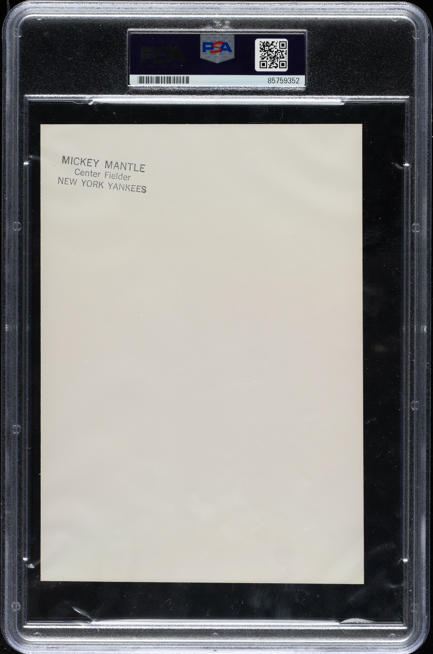 Original New York Yankees photo of Mickey Mantle, circa 1950s. Encapsulated and certified as an original Type I photograph by PSA/DNA. The portrait shot captures Mantle gazing into the camera. This image is the one used on Mantle's 1958-1961 Jay Publishing "Picture Pack" card. The reverse features a stamp with Mantle's name, team, and position. The photo, which has been trimmed to its current conditions of 5 x 7-1/8 inches, is in Excellent condition overall.