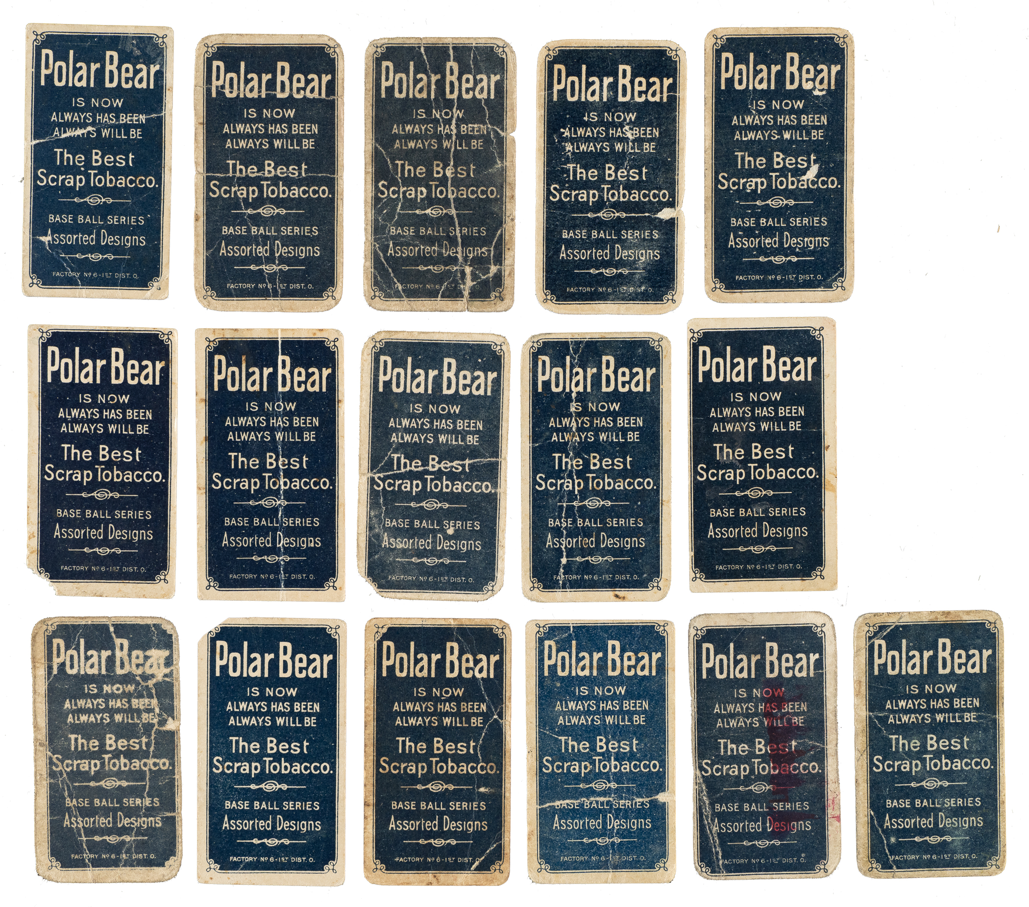 Collection of twenty 1909-1911 T206 White Border cards, all featuring Polar Bear advertising reverses. Polar Bears are an especially popular advertising back with collectors because of the distinct blue background and white printing. Condition is Poor overall, with two trimmed. This collection consists of the following: Abbott, Barger, Brashear, Dorner, Easterly, Engle, Hinchman, Hoblitzell (trimmed), I. Hoffman, Livingstone, Maddox, Merritt, Oldring/batting, O'Leary/hands on knees, Raymond (trimmed), Rhodes, Scott, Slagle, Stanage, and Wilhelm/with bat.Total: 20 cards.