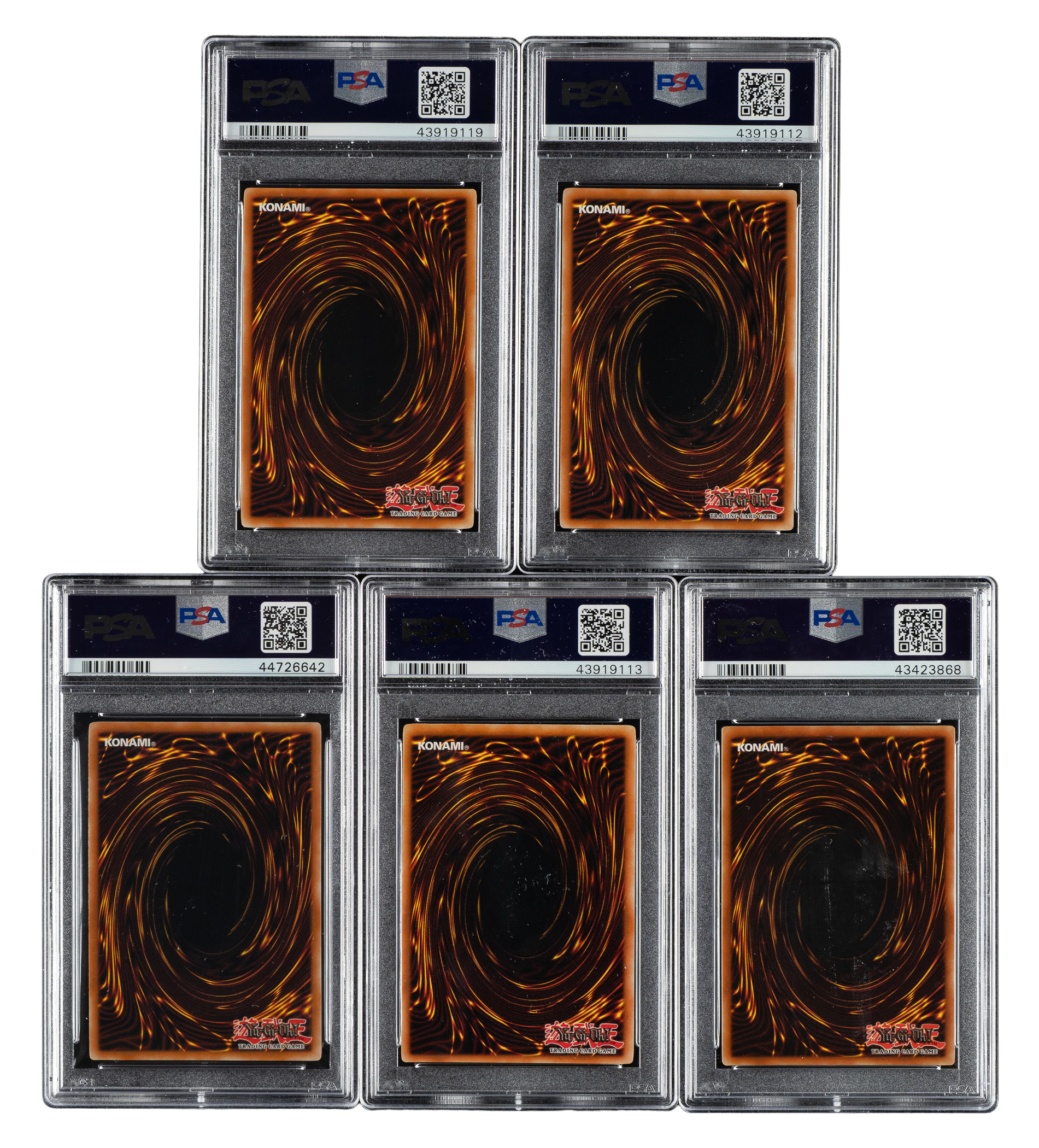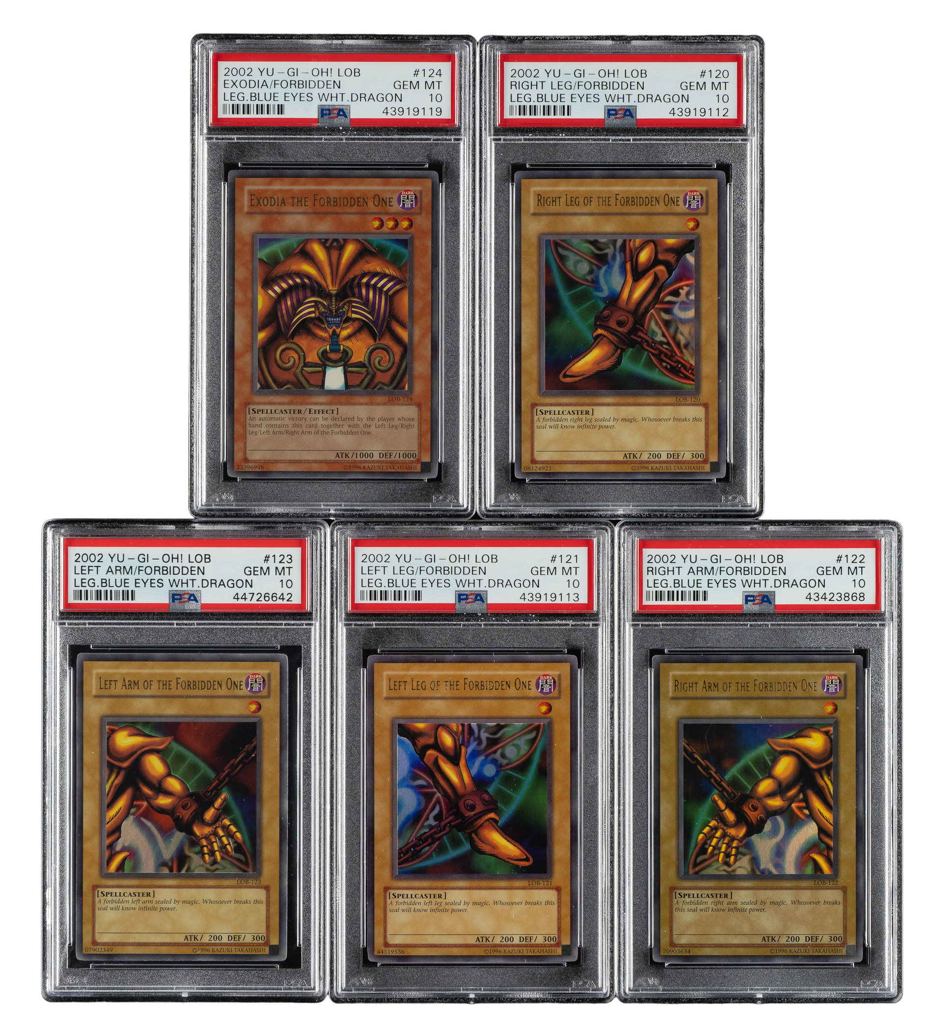 Complete set of 2002 Yu-Gi-Oh! Legend of Blue-Eyes White Dragon #120-124 Exodia The Forbidden One cards. All five cards have been graded GEM MINT 10 by PSA. In the trading card game, if a player assembles all five Exodia cards in their hand, they automatically win the match. Total 5 cards.