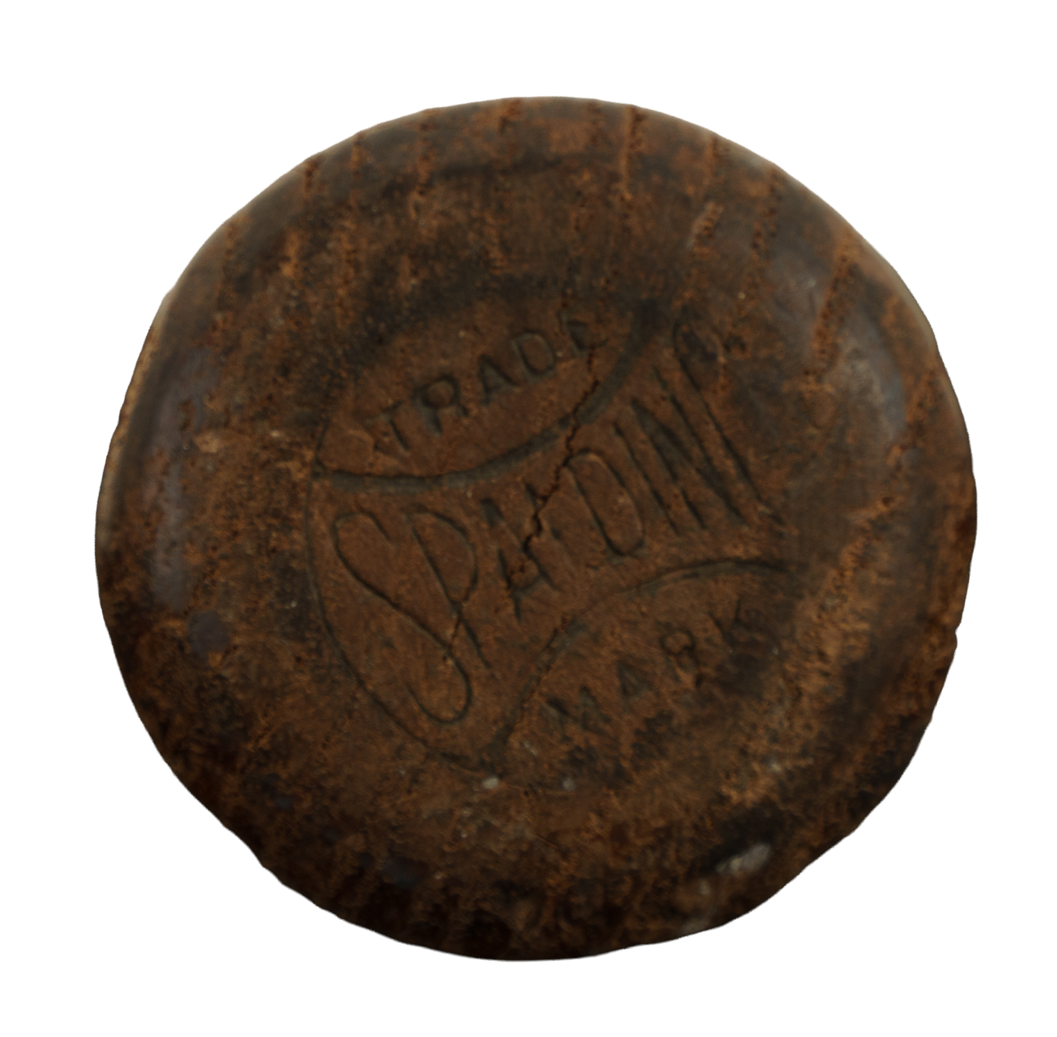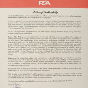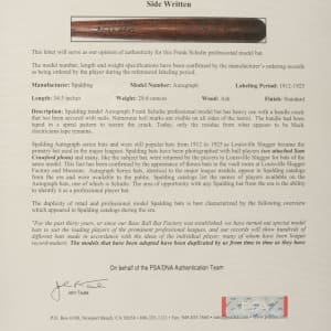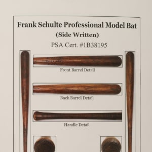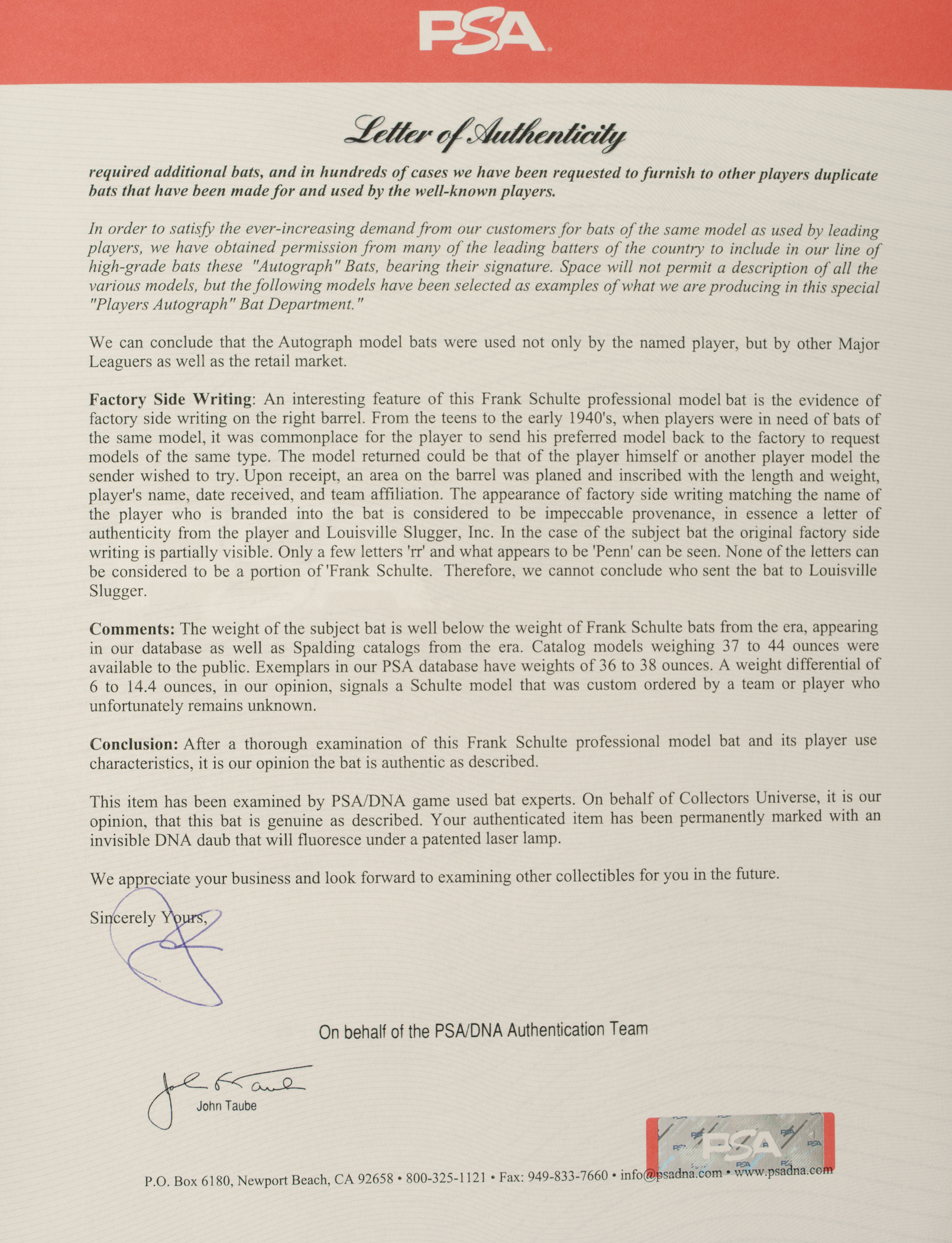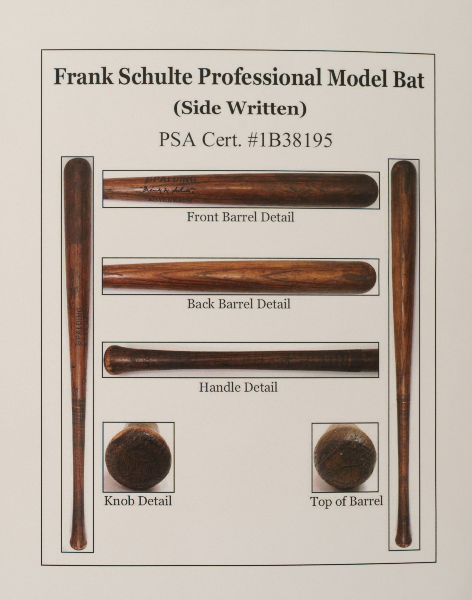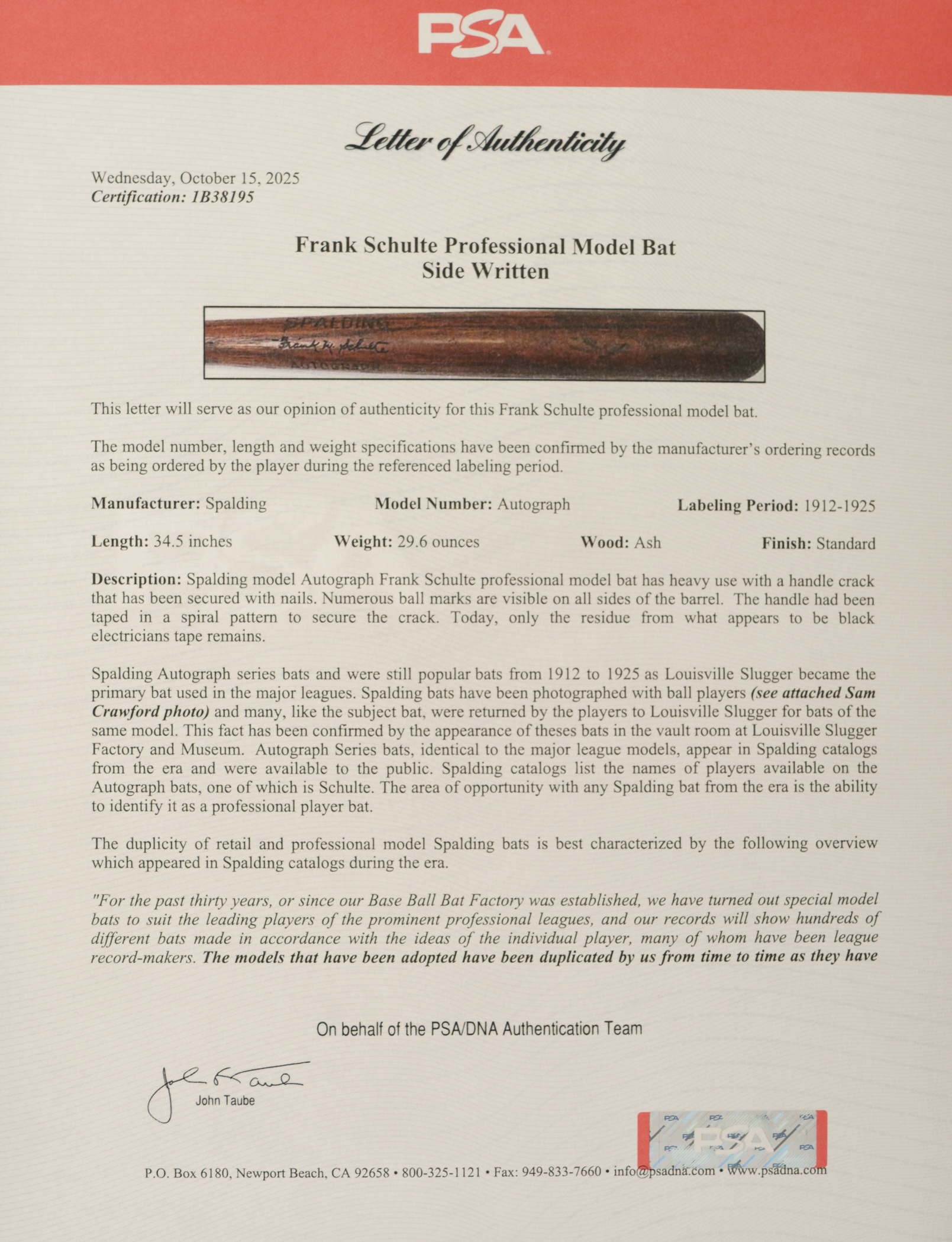 Frank Schulte Spalding "Autograph" signature-model bat (predating model numbers) dating from the 1912-1925 manufacturing period. The most distinguishing feature of this bat is the partially visible side writing on the barrel. Side writing is of great significance to collectors as it places a bat directly into the hands of the player so named. When players returned bats to the factory (to be used as templates for future orders), identifying notations including the player's name would be written in grease pencil on the side of the bat by an employee and stored in the vaults for future reference. In that regard, side writing on bats is recognized by many collectors as being the equivalent of having a letter of authenticity from the player himself. According to the PSA/DNA letter, "only a few letters can be seen. None of the letters can be considered to be a portion of 'Frank Schulte'." The bat has the Spalding logo stamped on the knob. According to PSA/DNA, the bat has evidence of "heavy use with a handle crack that has been secured with nails. Numerous ball marks are visible on all sides of the barrel. The handle had been taped in a spiral pattern to secure the crack. Today, only the residue from what appears to be black electricians tape remains." As noted in the accompanying LOA from PSA/DNA, the Spalding "Autograph" series bats were produced for the professional players whose name appears on the bat, but they were also available to other major league players and sold on the retail market. For a complete analysis of the bat, we refer all prospective bidders to the PSA/DNA LOA, which can be viewed in its entirety on our website. PSA/DNA concludes by stating that "After a thorough examination of this Frank Schulte professional model bat and its player use characteristics, it is our opinion that the bat is authentic as described." Frank "Wildfire" Schulte was one of the game's first great sluggers of the dead-ball era and the National League home run leader in both 1910 (10) and 1911 (21). 1911 also saw him hit .300 with a league-leading 107 RBI, numbers which earned him MVP honors at season's end. A member of the Cubs from 1904 to 1916, Schulte helped lead the club to four pennants and two World Championships during that span. He finished his career with a .270 average, 92 home runs, and 793 RBI. Length: 34.5 inches. Weight: 29.6 ounces. Full LOA from John Taube of PSA/DNA (corresponding sticker affixed to the handle). The size/weight of this item requires that there will be an additional shipping charge for this lot.