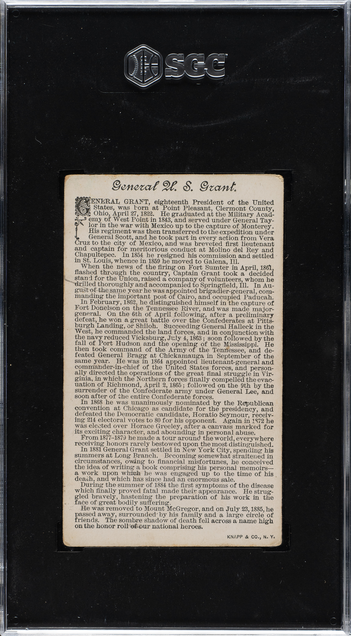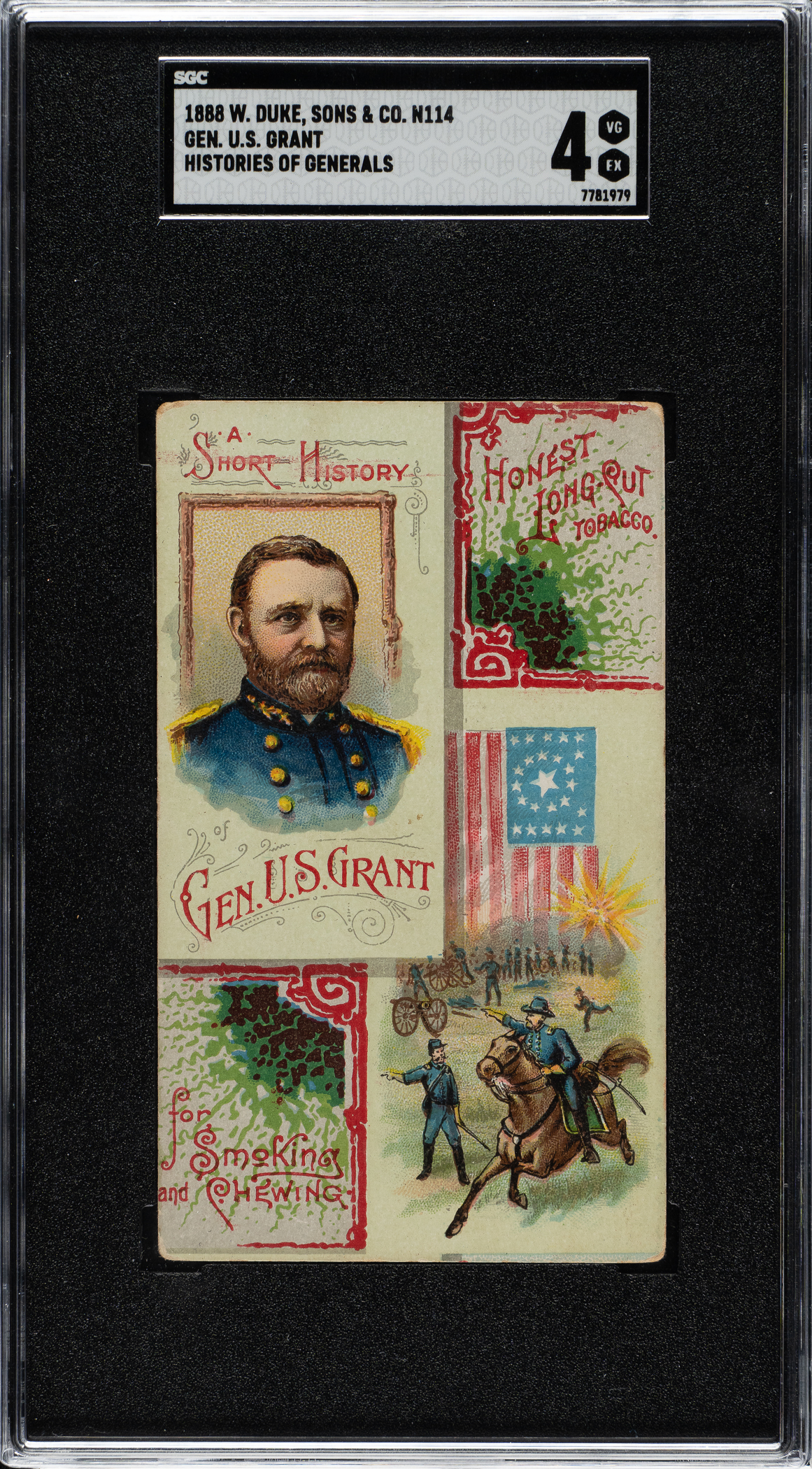 Graded VG/EX 4 by SGC. Ulysses S. Grant, 18th President of the United States (1869-1877). Only one example has been graded higher by SGC to date. Advanced collectors have long considered the N114 Duke "Histories of Generals" series to be one of the most impressive and desirable of all nineteenth-century nonsport tobacco-card sets.