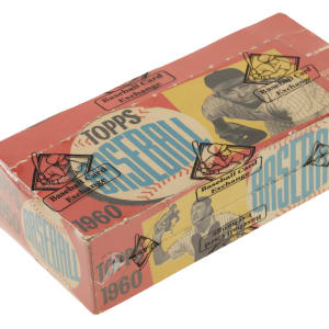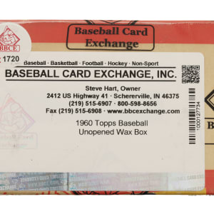 Presented is an astounding complete unopened wax box of 1960 Topps Baseball containing twenty-four original unopened 5-cents wax packs. This is an extremely rare complete unopened box! This is the only complete unopened wax box of this issue that we have offered in the past 21 years. The 1960 Topps set is very popular among collectors and features many stars of the era, including rookie cards of Hall of Famers Willie McCovey and Carl Yastrzemski, and many other Hall of Famers and stars, including Mickey Mantle, Hank Aaron, Roberto Clemente, Sandy Koufax, Willie Mays, and Stan Musial. The display box has survived with bright colors and moderate shelf wear, including a few creases on the back panel and two small tears on the top lid. The box comes shrink-wrapped by Baseball Card Exchange (owned by Steve Hart, the foremost expert on unopened material). This tremendous unopened wax box would make an incredible addition to even the most advanced baseball or unopened-box collection.