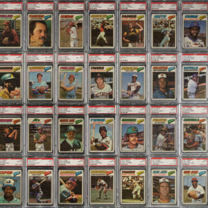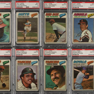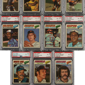 Presented is a very attractive high-grade PSA-graded complete set of 1977 Topps Cloth Stickers consisting of fifty-five cloth sticker cards, almost all stars. This set features mostly identical designs to cards found in the regular 1977 Topps series, printed on a silky cloth. With so few cards, it is not surprising that the set includes so many major stars and Hall of Famers such as cards of Brett, Jackson, Rose, Ryan, Bench, Brock, Carew, Carlton, Seaver, and Yastrzemski. Each card is graded and encapsulated by PSA. PSA Grading Composite: MINT 9 (44 cards): #1-4, 6, 7 Brett, 8-12, 14, 15, 16, 18-28, 31, 32, 34, 35, 36, 38 Rose, 40, and 42-53. NM-MT 8 (11 cards): #5, 13, 17, 29, 30, 33, 37, 39, 41, 54, and 55. Very crisp, clean, and attractive high-grade PSA-graded complete set of this popular and very unusual Topps issue. Total: 55 stickers. The size/weight of this item requires that there will be an additional shipping charge for this lot.