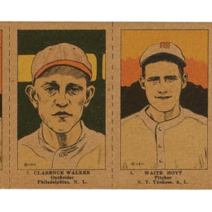 Outstanding original uncut strip of ten cards from the 1923 W515-1 strip-card set, highlighted by four Hall of Famers, including Babe Ruth and Ty Cobb. The popular W515-1 strip-card set consists of sixty different Major Leaguers. This issue was originally sold in horizontal strips of ten (as offered here), which were intended to be cut apart by hand by youngsters. Surviving, as-issued uncut strips are extremely rare! This uncut strip is all the more remarkable as it includes #3 Ruth and #10 Ty Cobb. The balance of the players featured are #1 Cunningham, 2 Mamaux, 4 Bancroft (HOF), 5 Rommell, 6 Adams, 7 Walker, 8 Hoyt (HOF), and 9 Shawkey. The panel is bright and clean with vibrant colors and a chipped left edge along the Cunningham card. The important Ruth and Cobb cards remain in excellent condition. This strip, which measures 13.75 by 2.25 inches, offers a superb opportunity to acquire an almost never-seen uncut strip of W515-1s, in its original form as they were issued at the candy store in 1923, highlighted by legendary Hall of Famers Babe Ruth and Ty Cobb.