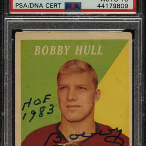 PSA/DNA has encapsulated the card, grading the signature GEM MINT 10 and certifying the card as "Authentic." Chicago Black Hawks Hall of Famer Bobby Hull.