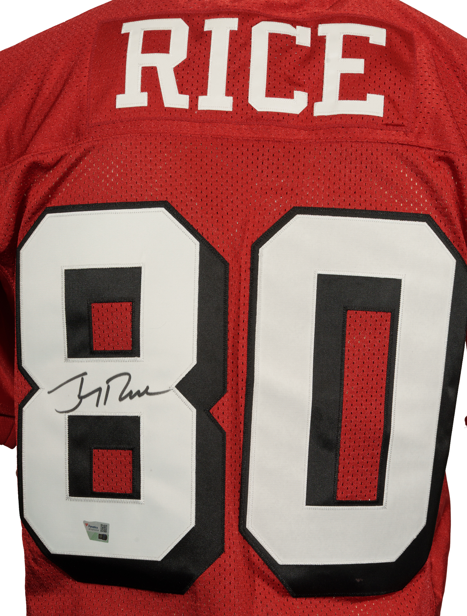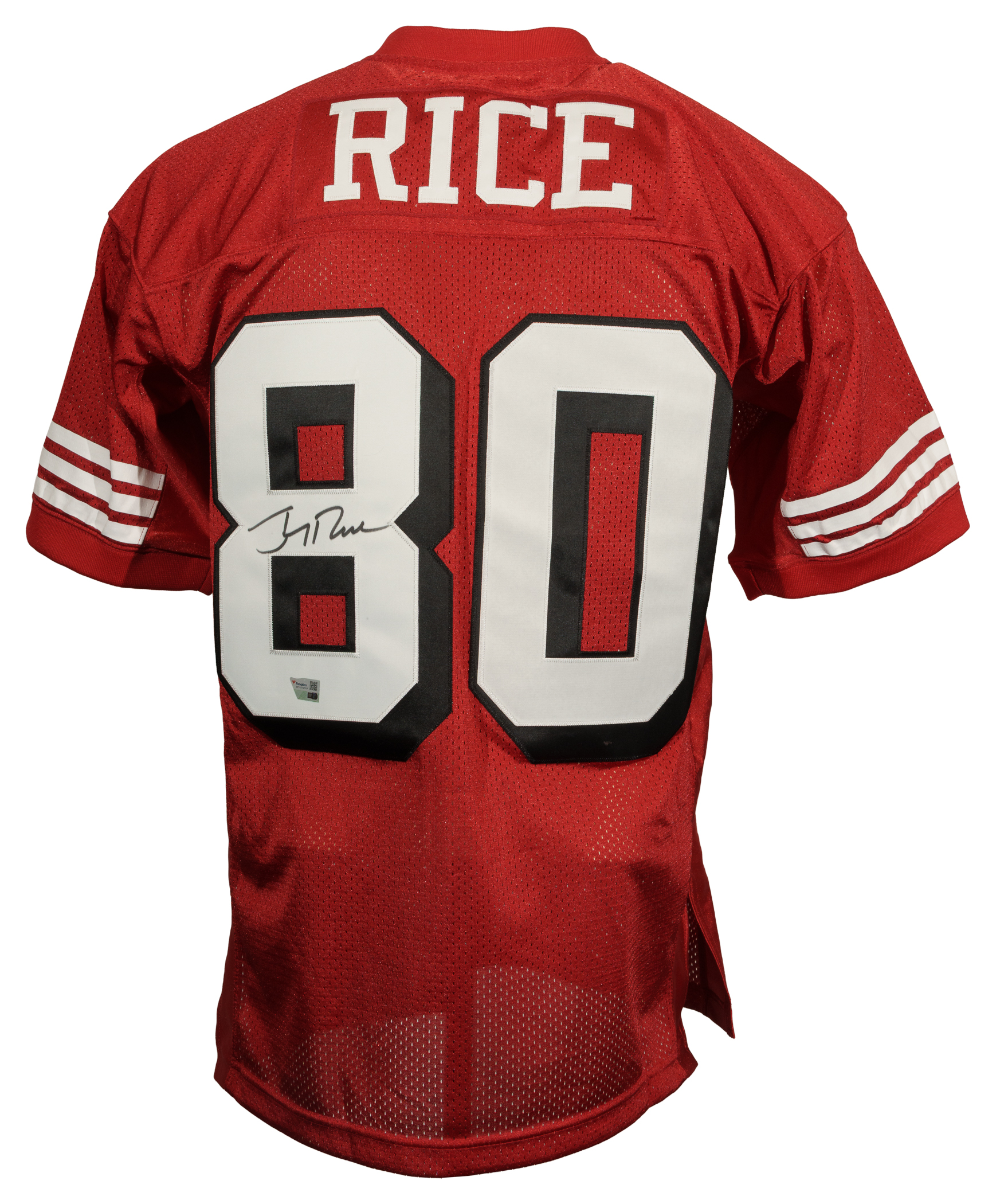 San Francisco 49ers Hall of Famer Jerry Rice signed jersey. Fanatics certification sticker is affixed to the jersey.