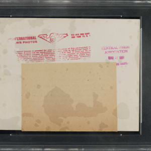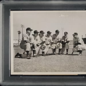 Original news photograph capturing seven members of the New York Yankees, including Mickey Mantle as a rookie and manager Casey Stengel, prior to spring training on February 27th or 28th in 1951 (the date is based on the fact that this image was used in the The Arizona Republic newspaper the morning of March 1st). The players are pictured posing together on the field in the their away uniforms. In 1951, for the first and only time in the club's history, the Yankees headed West instead of South for spring training, opening camp in Phoenix, Arizona. While news of DiMaggio's impending retirement at season's end was already circulating, it wasn't the biggest story in camp that spring. Most of the media attention was focused on a young outfielder who could hit with incredible power from both sides of the plate and run like a deer. His name was Mickey Mantle and his performance in the desert was already drawing comparisons to Ruth, Gehrig, and, in hushed tones, even DiMaggio. Encapsulated and certified as an original Type I photograph by PSA/DNA. An original paper news caption dated "3-4-51" appears on the reverse as well as a "International News Photos" credit stamp and a second date stamp "Mar 27 1951." Because this photo dates from prior to spring training of 1951, it holds the distinction of being one of the earliest photos ever to feature Mantle as a member of the New York Yankees. The photo (9 x 7-1/8 inches) has light creases (including a horizontal crease extending across the central image area) and a small spot of paper loss near the top border. In Good condition overall.