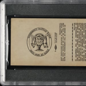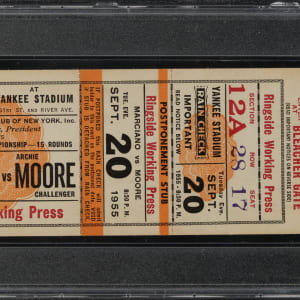 Full press ticket issued for the heavyweight title bout between Rocky Marciano and Archie Moore held at Yankee Stadium in New York on September 21, 1955. Graded EX-MT 6 by PSA. This is the ONLY full ticket ever graded at this level by PSA with none higher! This bout marked the last professional fight of Marciano's career, with him knocking out the challenger in the ninth round, ending with an undefeated record of 49-0. The ticket (7 x 2.5 inches), which is marked "Ringside Working Press,” has light handling wear.