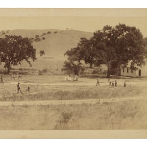 Rare circa 1860s cabinet photograph capturing a baseball game in progress. This an extremely early game-in-progress scene featuring all of the elements particular to baseball during its infancy. The scene includes most of the playing field, including the pitcher, who is striking the classic pitching pose from the era. The batter is standing at the plate, while the catcher is a short distance behind him. No gloves are used by any of the players, and the catcher lacks any of the protective equipment that would be standard a few decades later. Our only hint as to the location of the scene is that given by the photographer’s credit stamped on the reverse that reads “Churchill & Wilson/Photographers/Pixley/Cal.” The photo (7-7/8 x 4-1/2 inches) remains in Excellent to Mint condition with exceptional clarity and contrast. The mount (8-1/2 x 5-1/4 inches) displays a small crease on the top border and a corner bend on the lower right, as well as light staining and a pencil notation on the reverse.