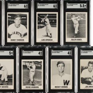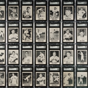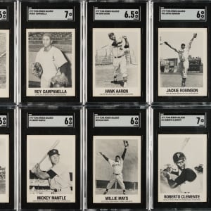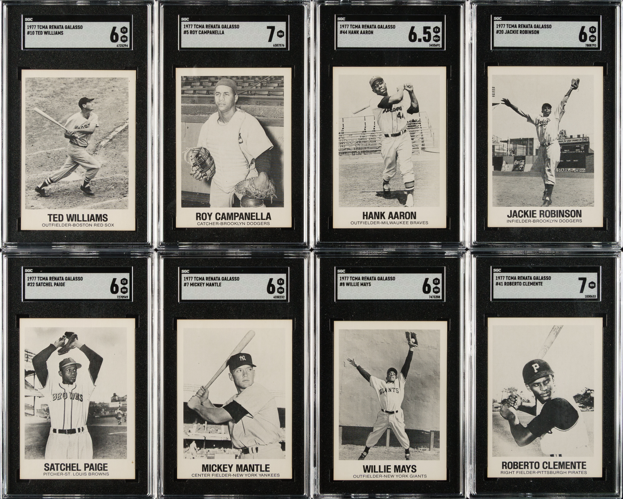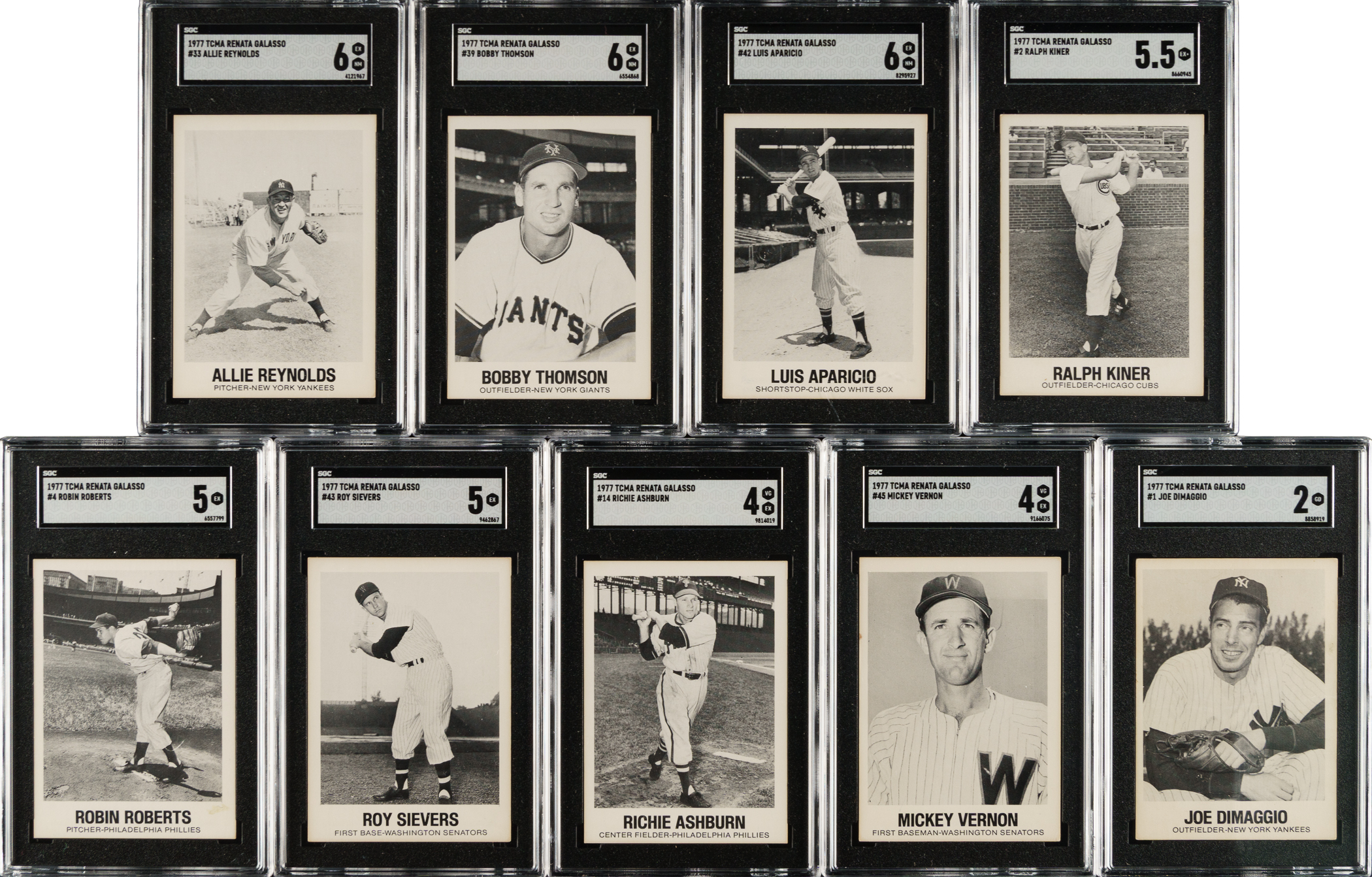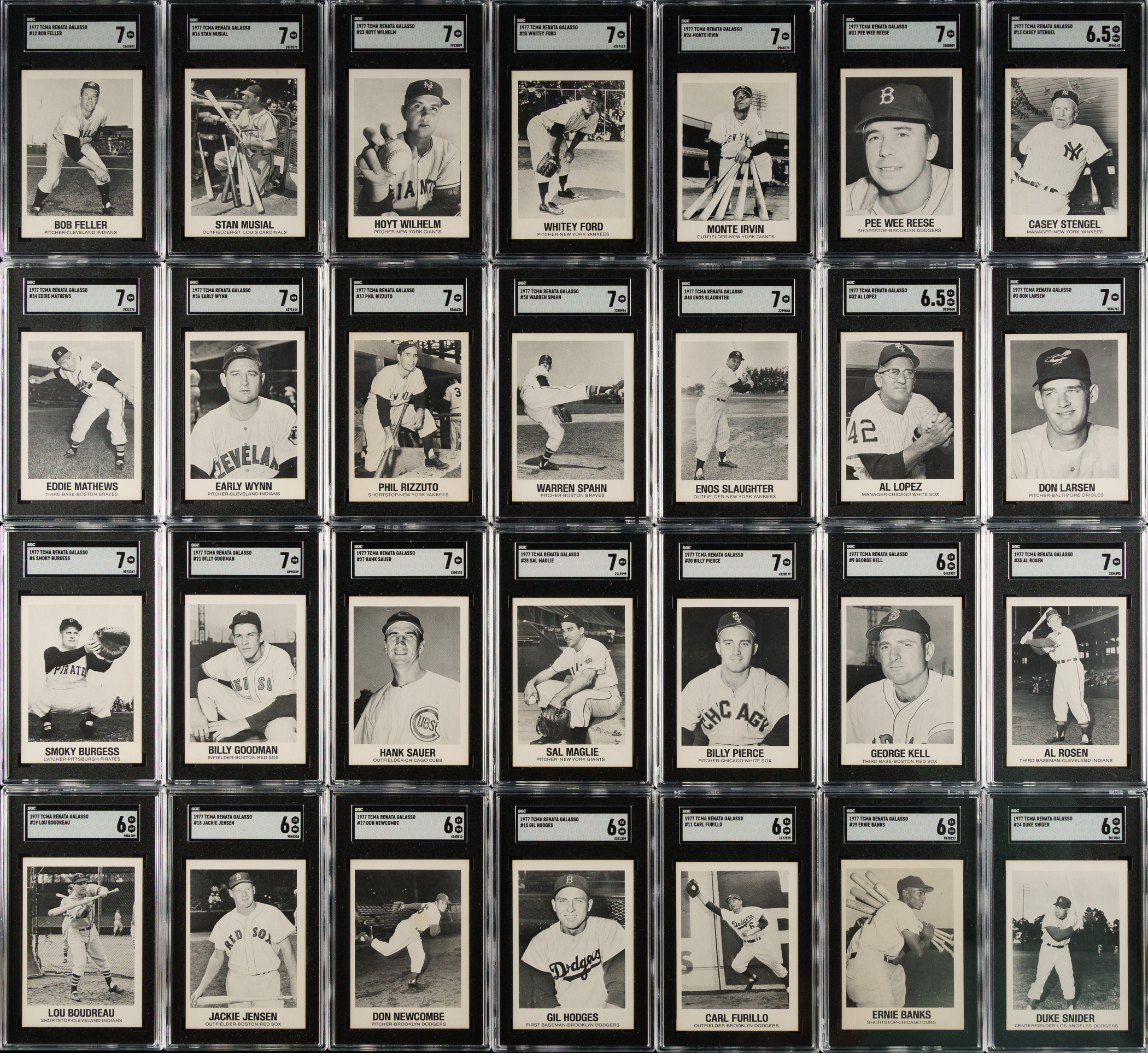 Complete set of 1977 TCMA Renata Galasso cards, each graded and encapsulated by SGC. SGC Grading Composite: NM 7 (20 cards): #3, 5 Campanella, 6, 12 Feller, 16 Musial, 21, 23 Wilhelm, 25 Ford, 26 Irvin, 27, 28, 30, 31 Reese, 34 Mathews, 35, 36 Wynn, 37 Rizzuto, 38 Spahn, 40 Slaughter, and 41 Clemente. EX/NM+ 6.5 (3 cards): #13 Stengel, 32 Lopez, and 44 Aaron. EX/NM 6 (16 cards): #7 Mantle, 8 Mays, 9 Kell, 10 Williams, 11, 15 Hodges, 17, 18, 19 Boudreau, 20 J. Robinson, 22 Paige, 24 Snider, 29 Banks, 33, 39, and 42 Aparicio. EX+ 5.5 (1 card): #2 Kiner. EX 5 (2 cards): #4 Roberts and 43. VG/EX 4 (2 cards): #14 Ashburn and 45. GOOD 2 (1 card): #1 DiMaggio. Total: 45 cards. The size/weight of this item requires that there will be an additional shipping charge for this lot.