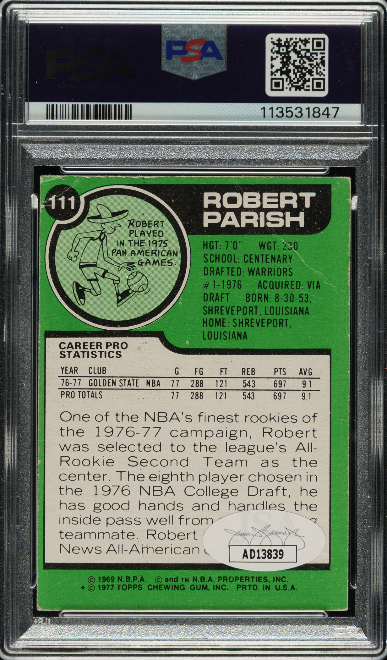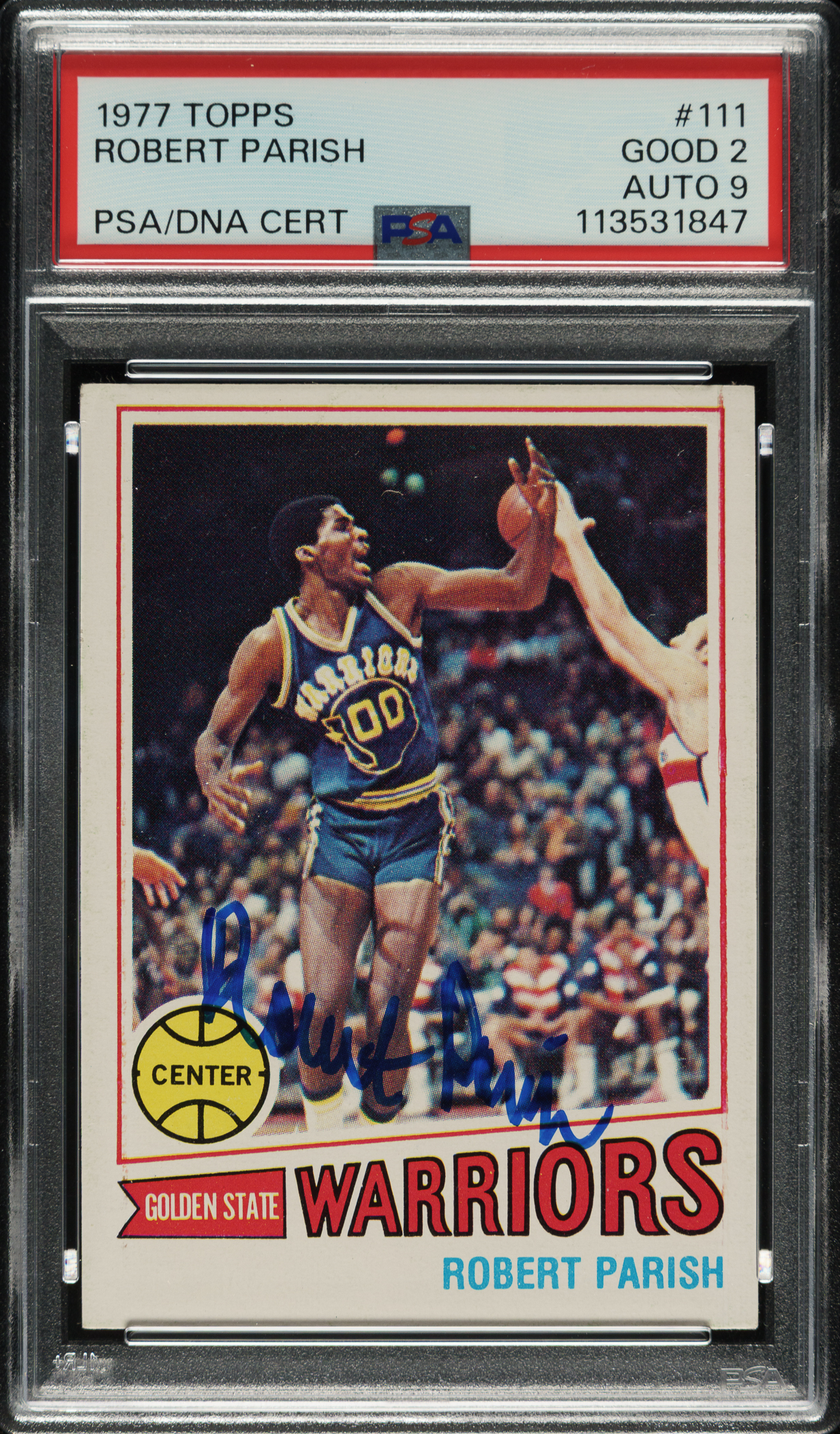 PSA/DNA has encapsulated the card, grading the signature MINT 9 and the card GOOD 2. Golden State Warriors basketball Hall of Famer Robert Parish.