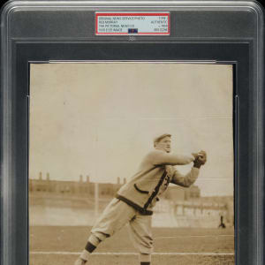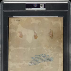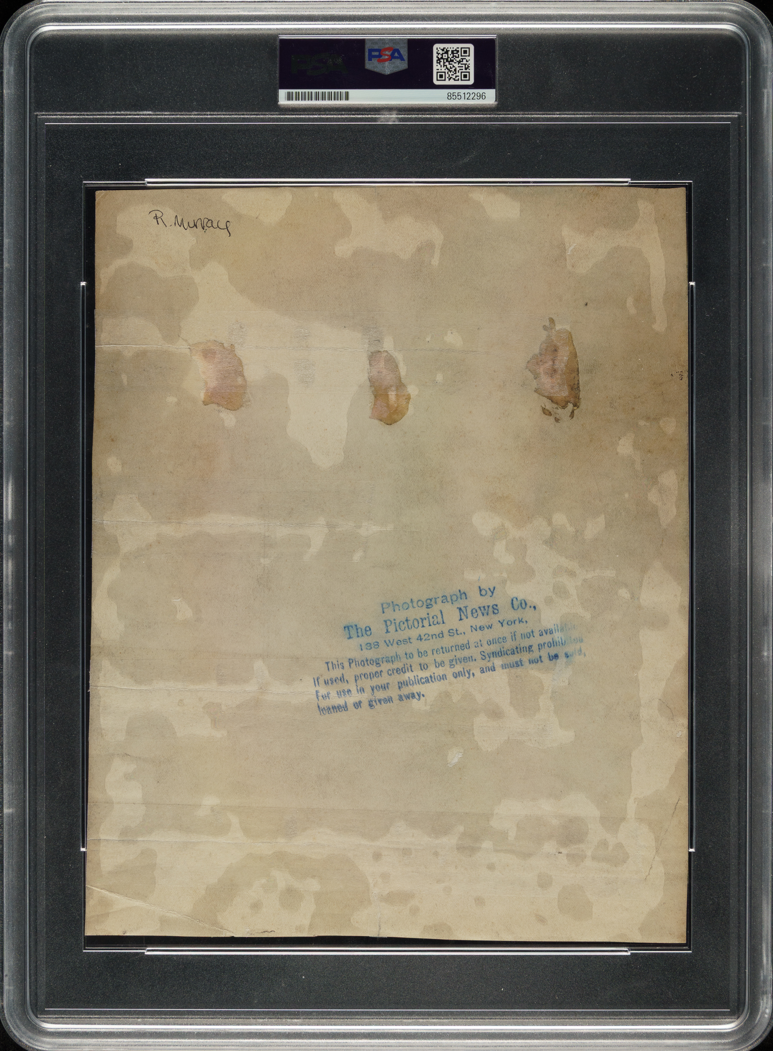 Original photo of Red Murray used in the production of Murray's 1910 E125 card. Encapsulated and certified as an original Type 1 photograph by PSA/DNA. Murray is captured in his New York Giants uniform, warming up on the sideline. Photos used in the production of trading cards have become increasingly popular in recent years. This is one of only a small number of vintage photos we have seen featuring a player image used in the E125 series. A "Pictorial News Co." credit stamp appears on the reverse, along with three pieces of adhesive residue and Murray's name written in black ink. The photo (7.5 x 9.25 inches), which has been trimmed to its current dimensions, exhibits heavy creasing, multiple small spots of paper loss, and a tear along the bottom edge. Technically in Poor condition overall, but with far superior visual appeal.