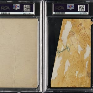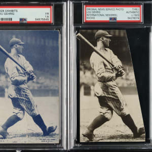 Offered is a pair of striking Lou Gehrig items: an exceptionally rare rookie-season photo of Gehrig in 1923, accompanied by a 1928 Exhibits Gehrig card. The 1923 photograph is the same image used for Gehrig's 1928 Exhibits. Together, they make for an extraordinary visual display! Photos used in the production of trading cards have become increasingly popular in recent years, especially those featuring prominent Hall of Famers such as Gehrig. 1) Photo. Encapsulated and certified as an original Type I photograph by PSA/DNA. This is the first Type I example of this photo we have ever offered, and we cannot recall having seen another at auction. To our knowledge, only one other Type I photo of this image exists. While Gehrig's 1925 and 1927 Exhibits image originated from the 1924 spring training session, this is an even earlier image, dating from Gehrig's true rookie season taken at Yankee Stadium! Gehrig is captured in a full-length batting pose. The reverse displays an "International Newsreel" credit stamp, Gehrig's handwritten name, and mounting residue. The photo (3.25 x 5.25 inches), which has been neatly trimmed to its current dimensions for publication use, is in Excellent condition overall. 2) Card. Graded FAIR 1.5 by PSA. One of the key cards to the 1928 Exhibit card set, this blue-tinted card with a postcard-style back was produced by the Exhibit Supply Co. of Chicago. The offered card has a bright, crisp image of Gehrig. Downgraded due to creasing. Total: 2 items: (1 photo and 1 card).