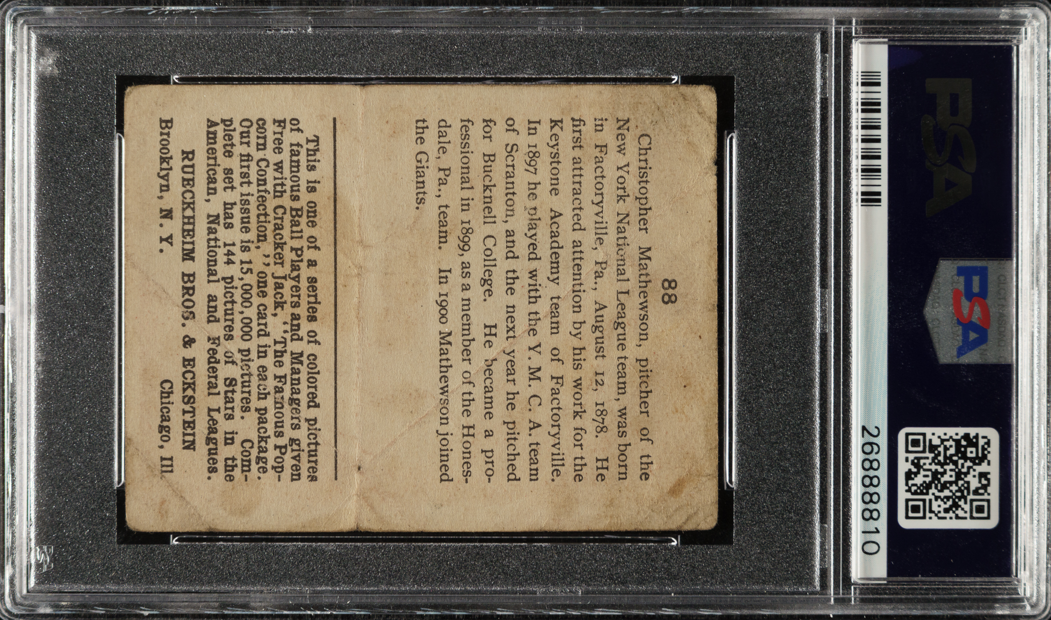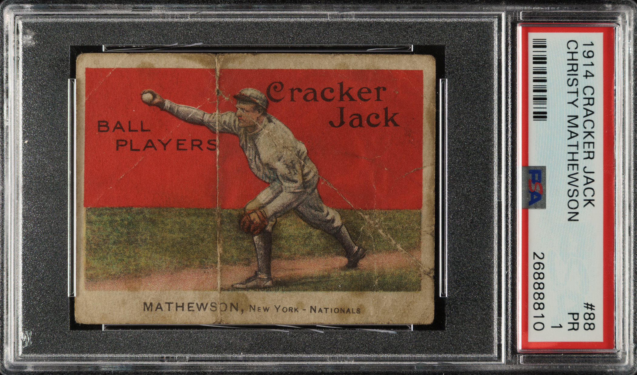 Classic example of Christy Mathewson from the 1914 Cracker Jack #144 series. This is one of the rarest and most desirable of all Mathewson cards and one of the most important of all Cracker Jacks. Christy Mathewson appears in a horizontal pitching pose in the 1914 Cracker Jack set, as opposed to the more familiar portrait pose of the 1915 set. Because there is no 1915 Cracker Jack alternative to the 1914 Cracker Jack Mathewson pitching pose, this card is of particularly great significance to Cracker Jack and Hall of Fame card collectors. It is universally recognized as one of the rarest and most important Cracker Jack cards, and is recognized as the key signature card of the entire 1914 Cracker Jack set. The offered card features a bold red background and a strong image of Mathewson. The caramel staining, while noticeable, isn't severe (serious staining can often be a problem with 1914 Cracker Jacks because the 1914 cards were only distributed in boxes of Cracker Jack, as opposed to cards from the 1915 "factory sets." Graded POOR 1 by PSA largely due to heavy creasing. Despite its flaws, this remains a presentable example of this significant prewar card featuring key Hall of Famer Christy Mathewson.